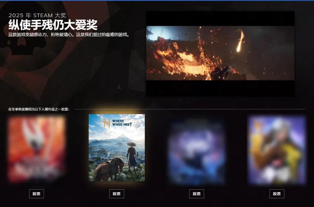 承蒙游侠抬爱,我们成功入围2025年STEAM大奖之“纵使手残仍大爱”奖。在周年版本中,亦有更多强敌登场,希望届时能给游侠带来更多战斗乐趣。