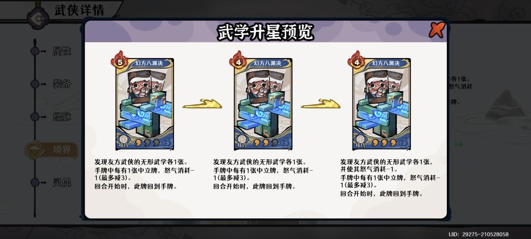 翻译:发现两张友方武学,回合开始时入手。(最低0命为2怒,1命(入境)为1怒,3命(慧积)使发现牌怒气消耗-1)