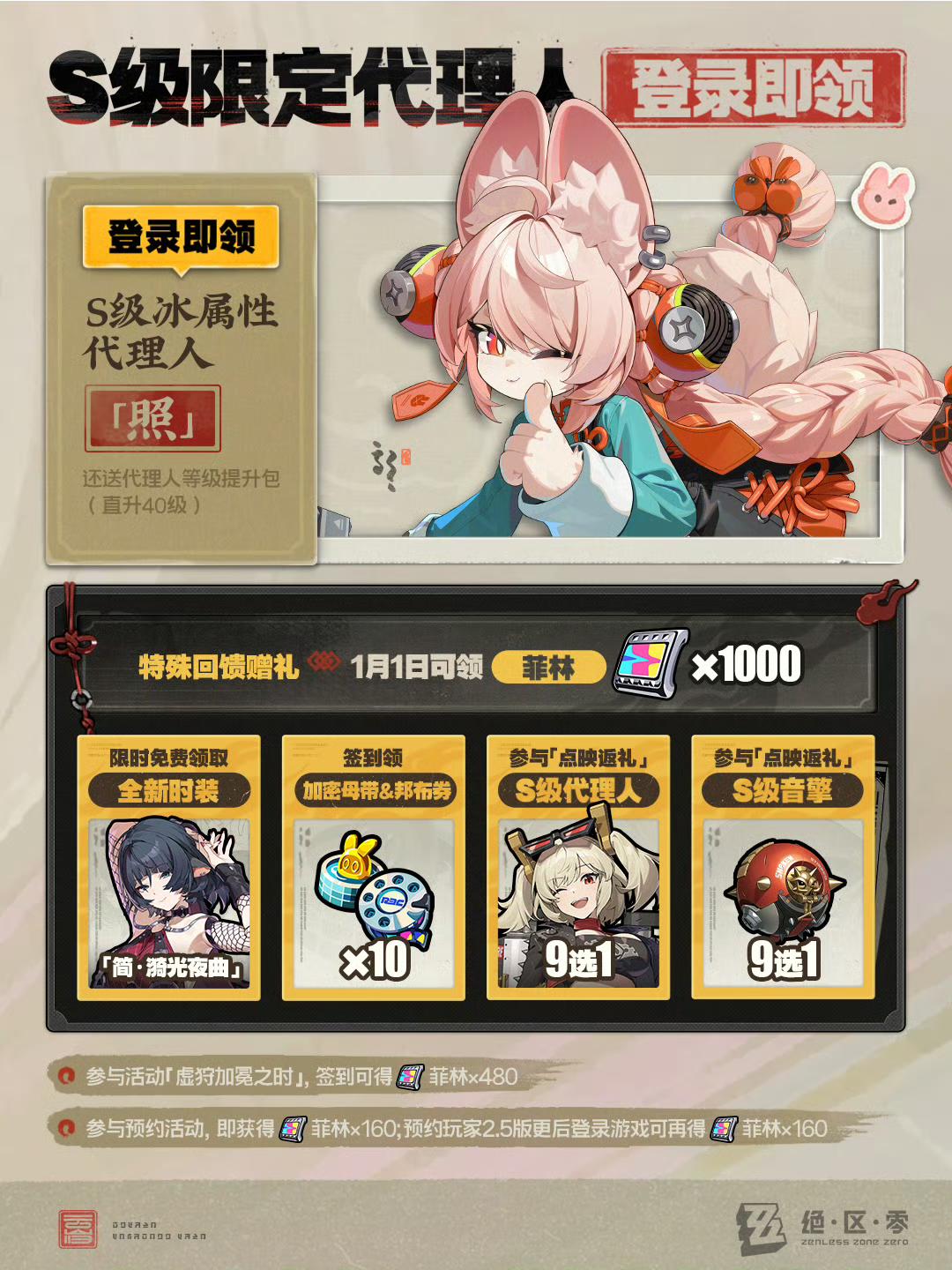 核心福利方面,版本期间玩家可限时免费领取全新限定 S 级代理人「照」,配套直升 40 级养成补给同步送出,助力快速成型战力。代理人「简」的全新时装「漪光夜曲」将开启 100% 限时折扣,玩家登录即可免费解锁。1月1日将发放特殊回馈赠礼菲林×1000,版本内签到还能领取「加密母带 ×10」「邦布券 ×10」,为抽卡提供充足资源。