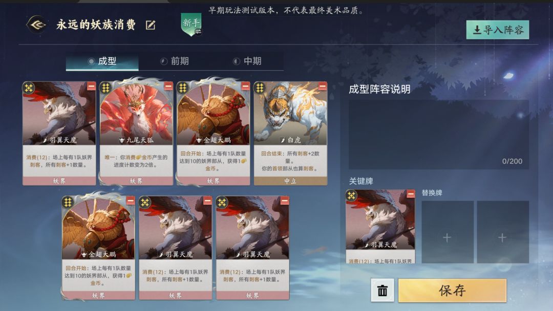 蜘蛛精起手,消费骑需要至少的5妖气,蜘蛛精可以让你不关注妖气获取的情况下凑齐保底妖气,在前两本不用停留,三本可以搜一搜牌,能拿鸟妖和通用骑兵,之后速升五
