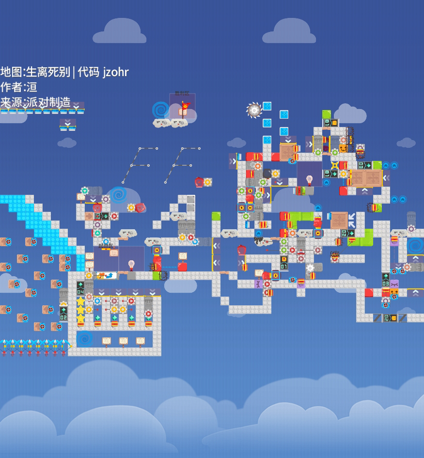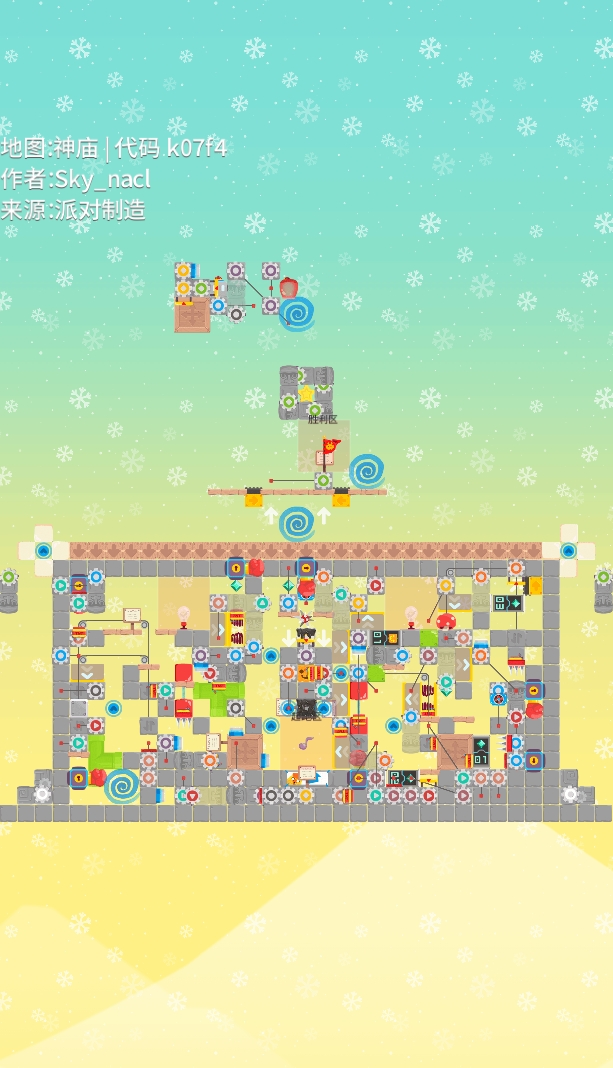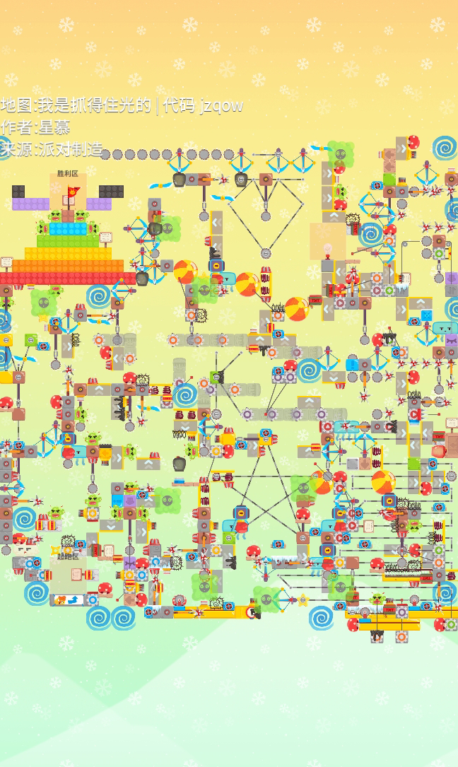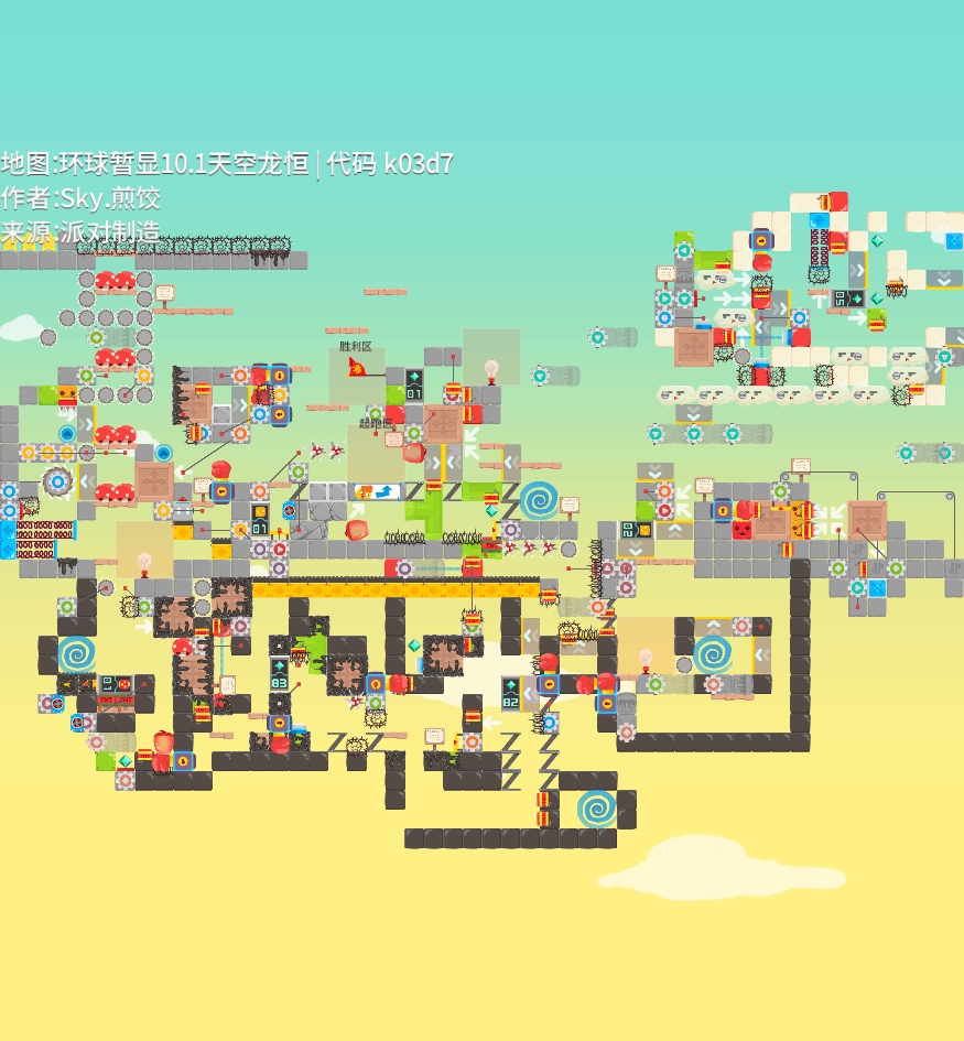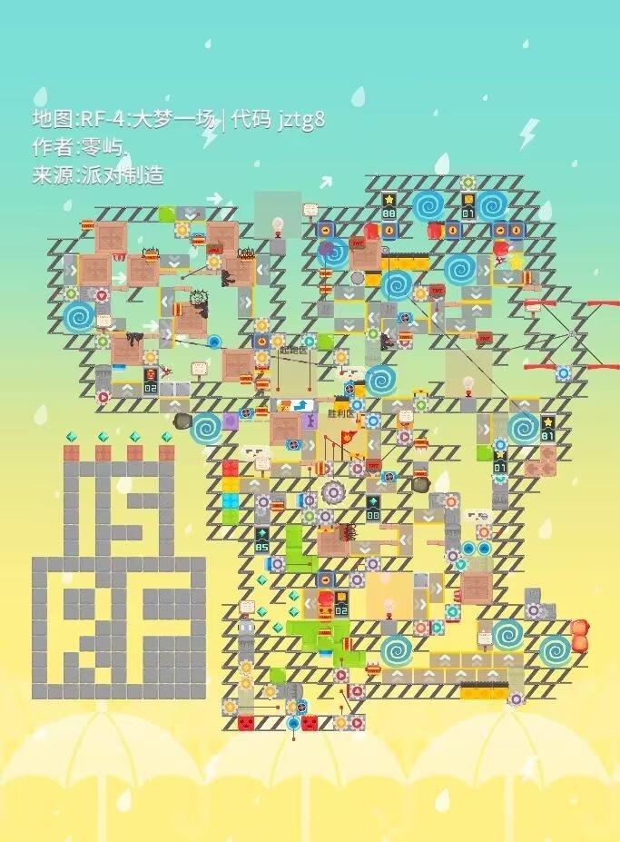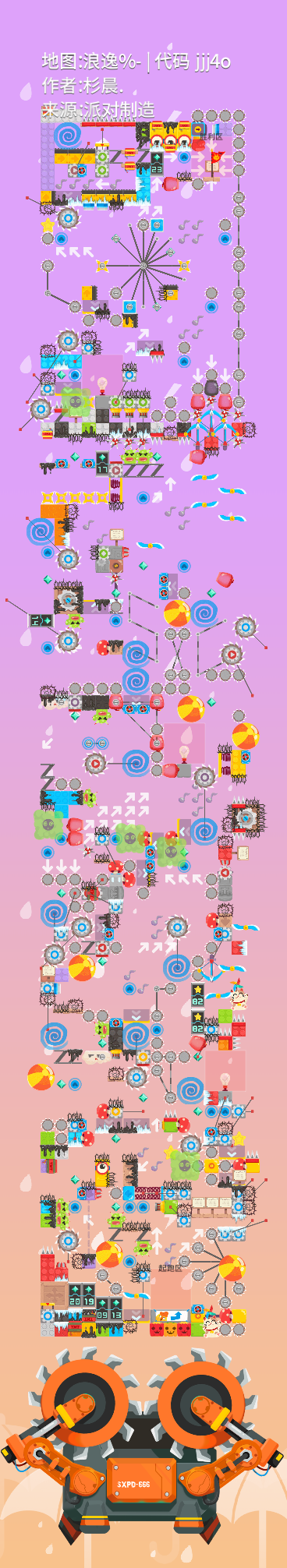 整体从下往上,综合利用了记忆点的各种玩法(退档、换键、各种特性…),可以说是各类创意自动图的浓缩版,可玩性非常强,同时漫天的陷阱、组件之间的联动组合和全程的小机器人互动也给地图添了不少的色彩,路线的转换与飞跃都非常强——