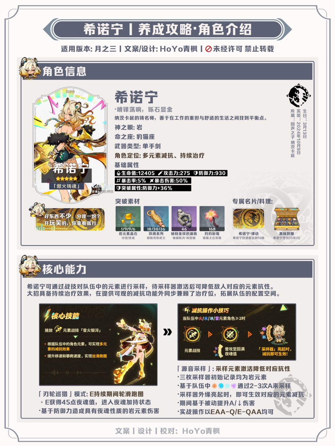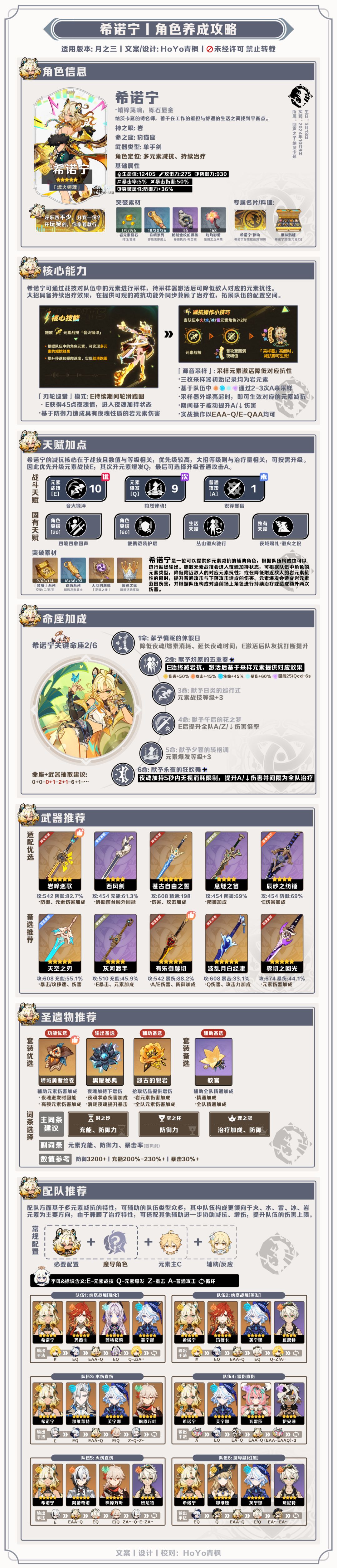 ●希诺宁是一位提供多元素减抗的辅助型角色,可进入夜魂加持状态,配合烬城套进一步提供元素增伤,同时还兼顾治疗位,可搭配更多功能型辅助协助提升主C输出,基于其战技的采样特性,队伍构建通常倾向于火、水、雷、冰、岩的队伍类型,不适合风、草、物理、剧变反应的队伍类型;