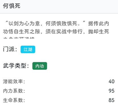 被誉为大号灵元决,八门双惧整套最拉胯的组件,脱离八门与无惧的何惧强度特别低,过于贫弱的生命系数决定了八门双惧这个血量非常重要的套路不会有太高的血上限,与江湖主流内功丰沮道藏相差甚远。但在八门双惧套路中,何惧的回血是不可或缺的。
