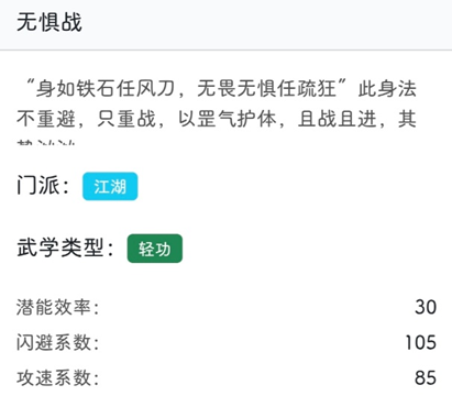 虽然此技能效果与数值不敢恭维,但决定了八门双惧总体的技能思路。以半血为分界点,50%血量以上能够恢复气血内力,50%血量以下则是攻击附伤且耗内增加。与无惧战的真罡效果具有联动,可以理解为,当你拥有无惧战的真罡效果并且受击且有受伤,才会触发额外回血回内以及额外附伤,且效果随真罡承伤外实际受伤增加而增加,也就是无惧战特有的真罡承伤记录。(依旧限定无惧的护体真罡,其他的技能例如武当的太极真罡不算)