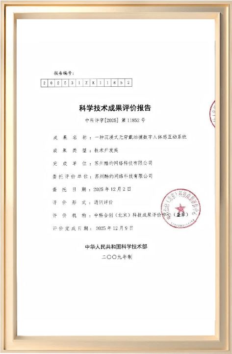 近日,酷约科技自主研发的“沉浸式无穿戴动捕数字人体感互动系统”,顺利通过中国科学院权威科技查新,成功拿下“综合技术达到国内领先、国际先进水平”的官方认证!