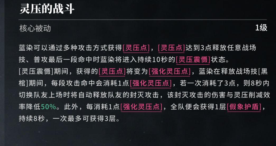 其中,压制值需要队友输出,用于后台站场技的增伤。灵压点和战场技能量则是和黑棺直接相关。