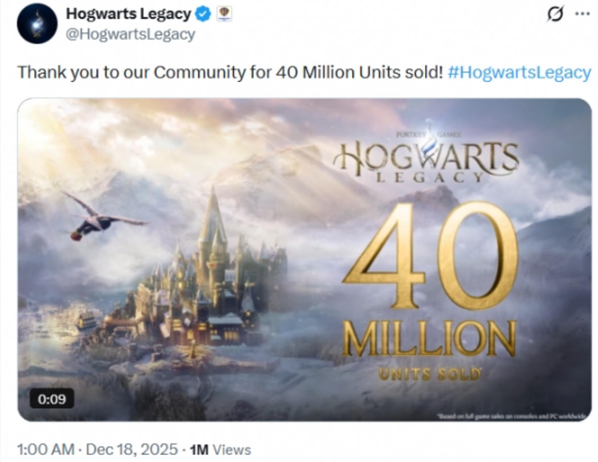 2025年12月18日,华纳兄弟游戏宣布,《霍格沃茨之遗》的全球销量超过了4000万份。