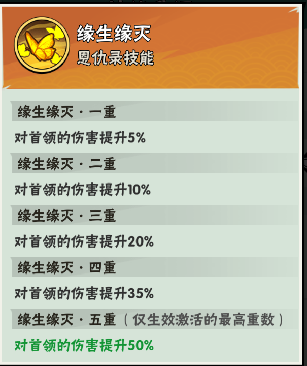每一章有一个主要技能,能升级的时候,优先升级主要技能,主要技能第一章是同仇敌忾,第二章是缘生缘灭,第三章是刻骨铭心,如下图: