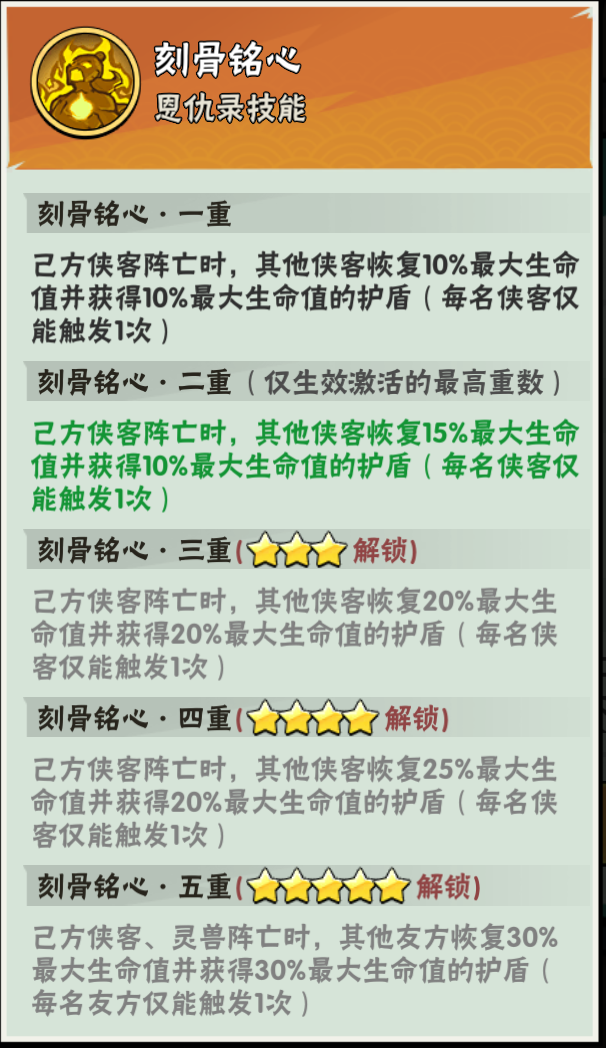 同仇敌忾全体减伤,开局触发,持续90秒,竞技模式持续15秒。争议很大的技能,有人觉得厉害好用,也有人觉得这游戏减伤不生效,很垃圾,减伤了也扛不住,因为分歧就导致有些人升满,有些人只是解锁,不升级。具体需不需要升级,每个人战力不同,阵容不同,需要自己去衡量。