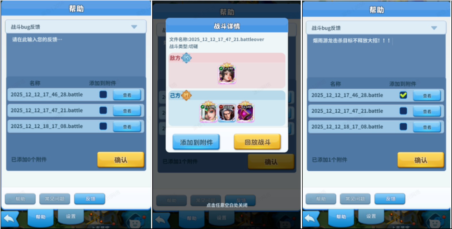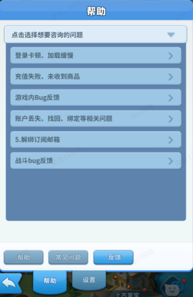 1、“帮助-反馈”界面新增“战斗bug反馈”选项