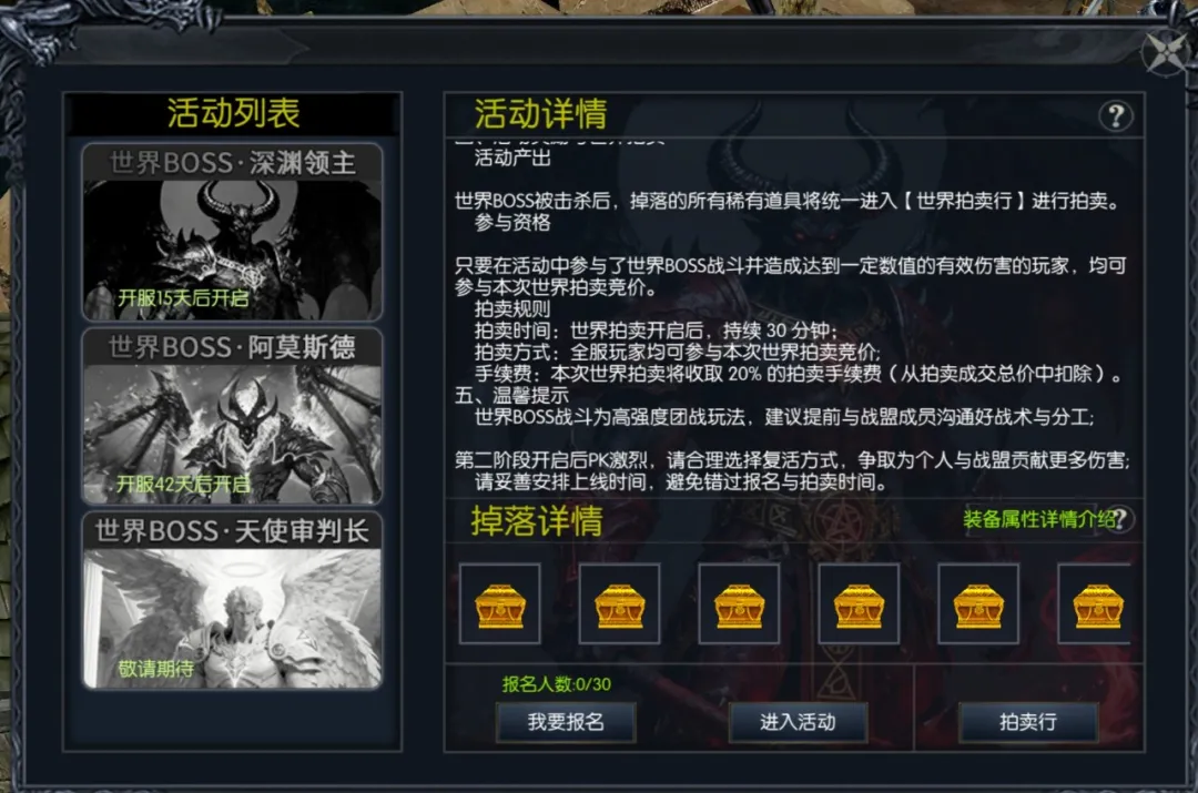 深渊领主、阿莫斯德、天使审批长……定时刷新,全服争夺。首刀归属、掉落保护,策略与实力并存。高价值道具直接掉落,更有世界拍卖行让全服分红。