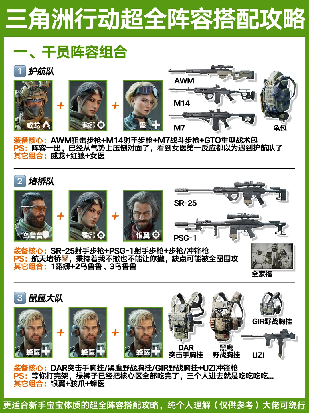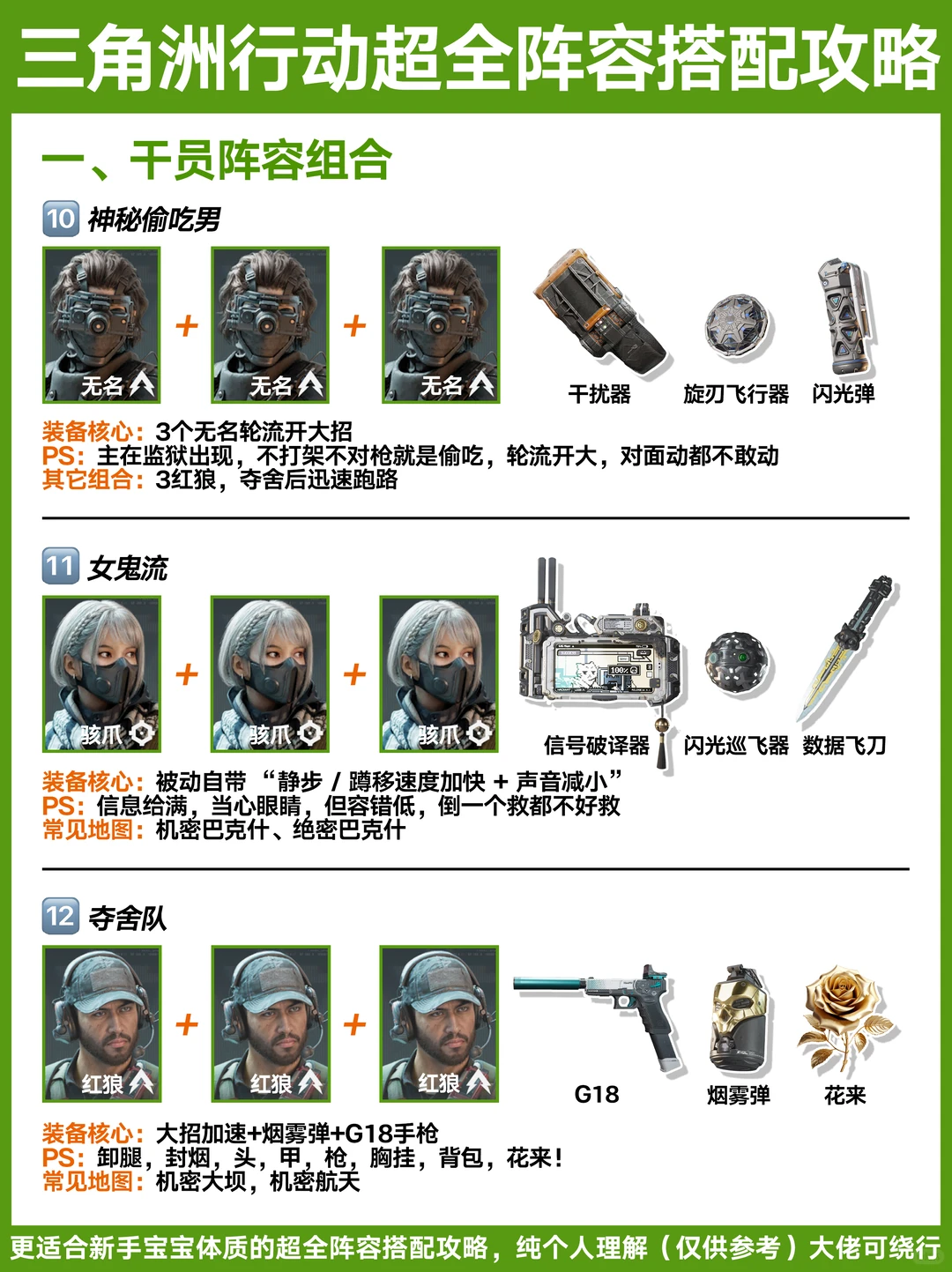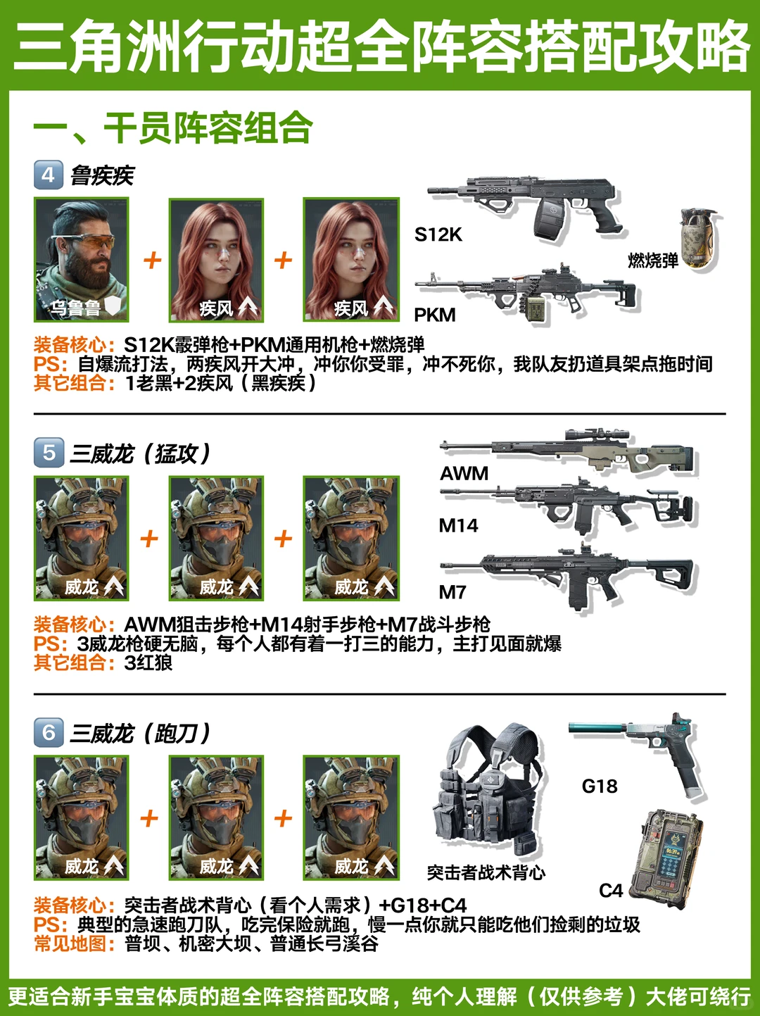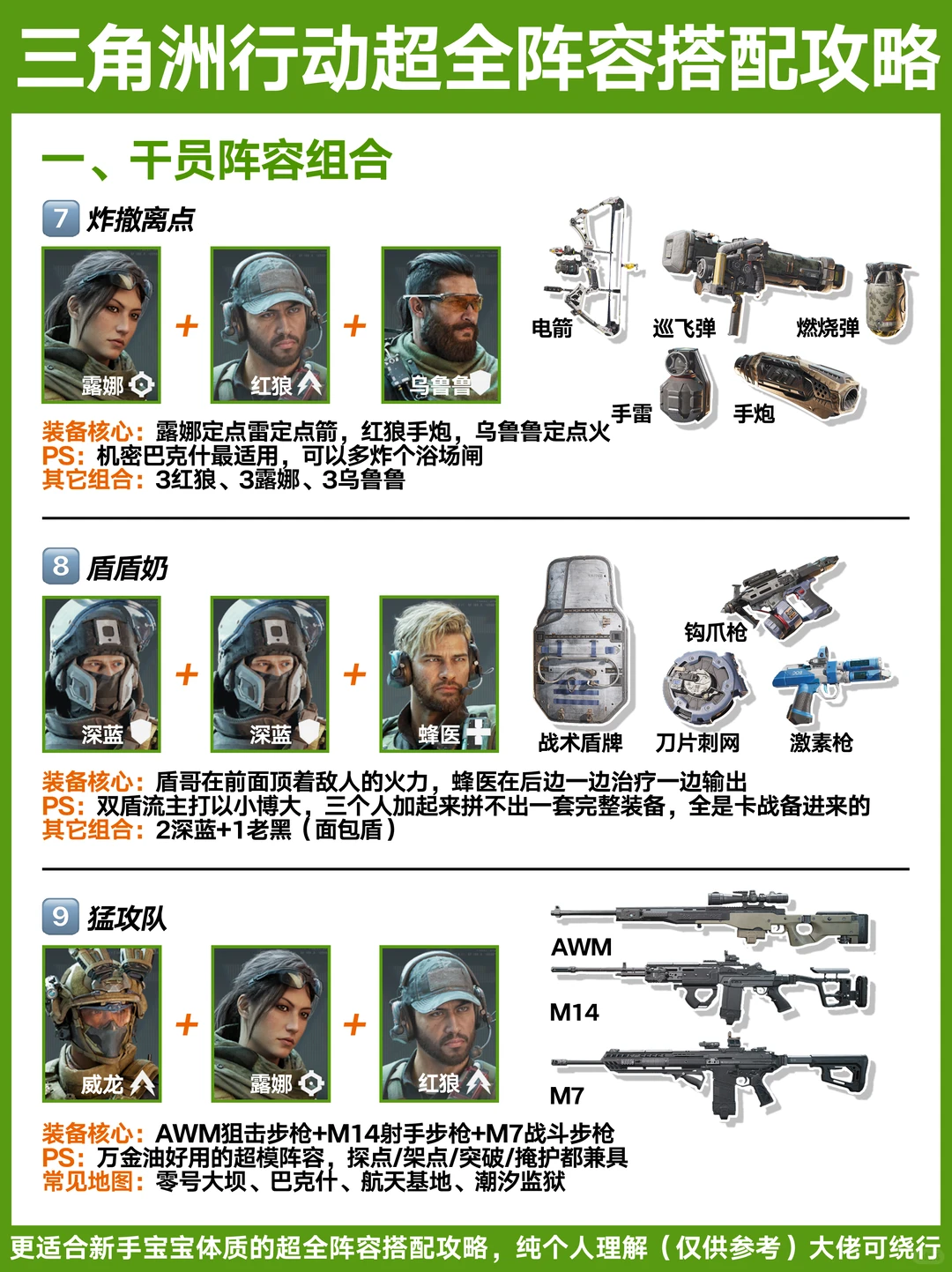 上面的干员阵容仅供参考,实际在三角洲里可以根据队友的技能熟练度、地图特点和自己的喜好来调整,建议新手宝宝多尝试不同阵容,找到蕞适合自己的组合~