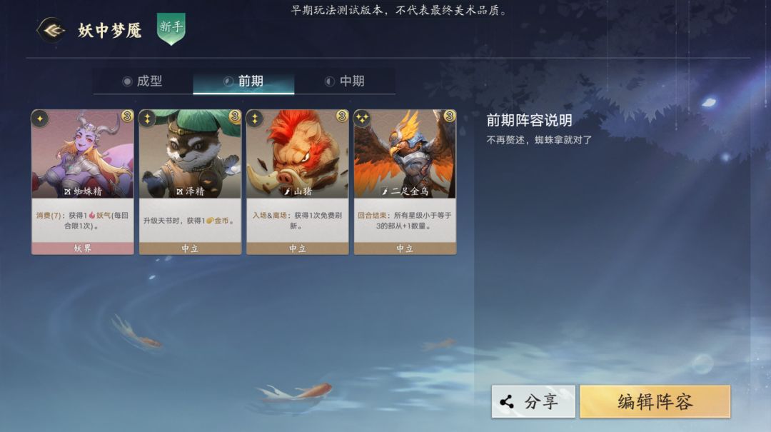 在妖气流的基础上,用梦魔和白无常替换掉三尾来作为整体战力,同时梦魔还可以每回合提供数金币的收益,相当于更强的大鹏👍👍