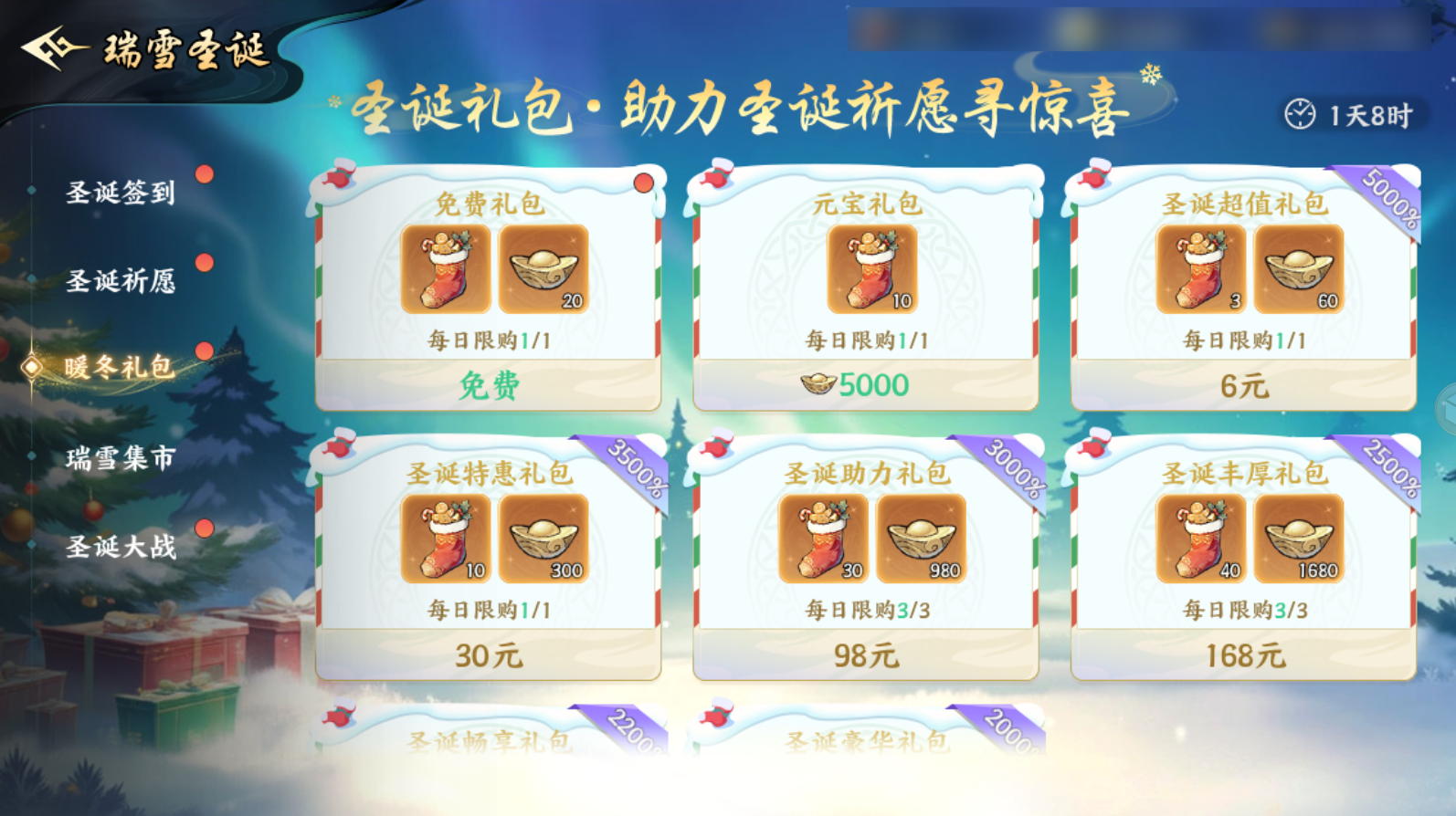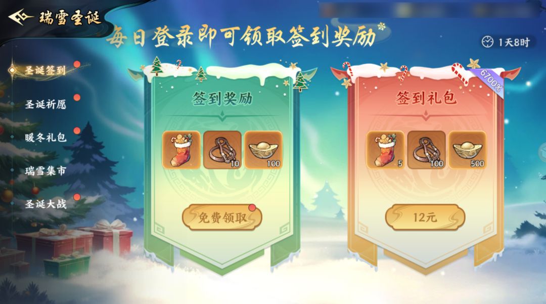 每日可领取免费礼包一份,其它消费可根据需求获取“圣诞袜”。