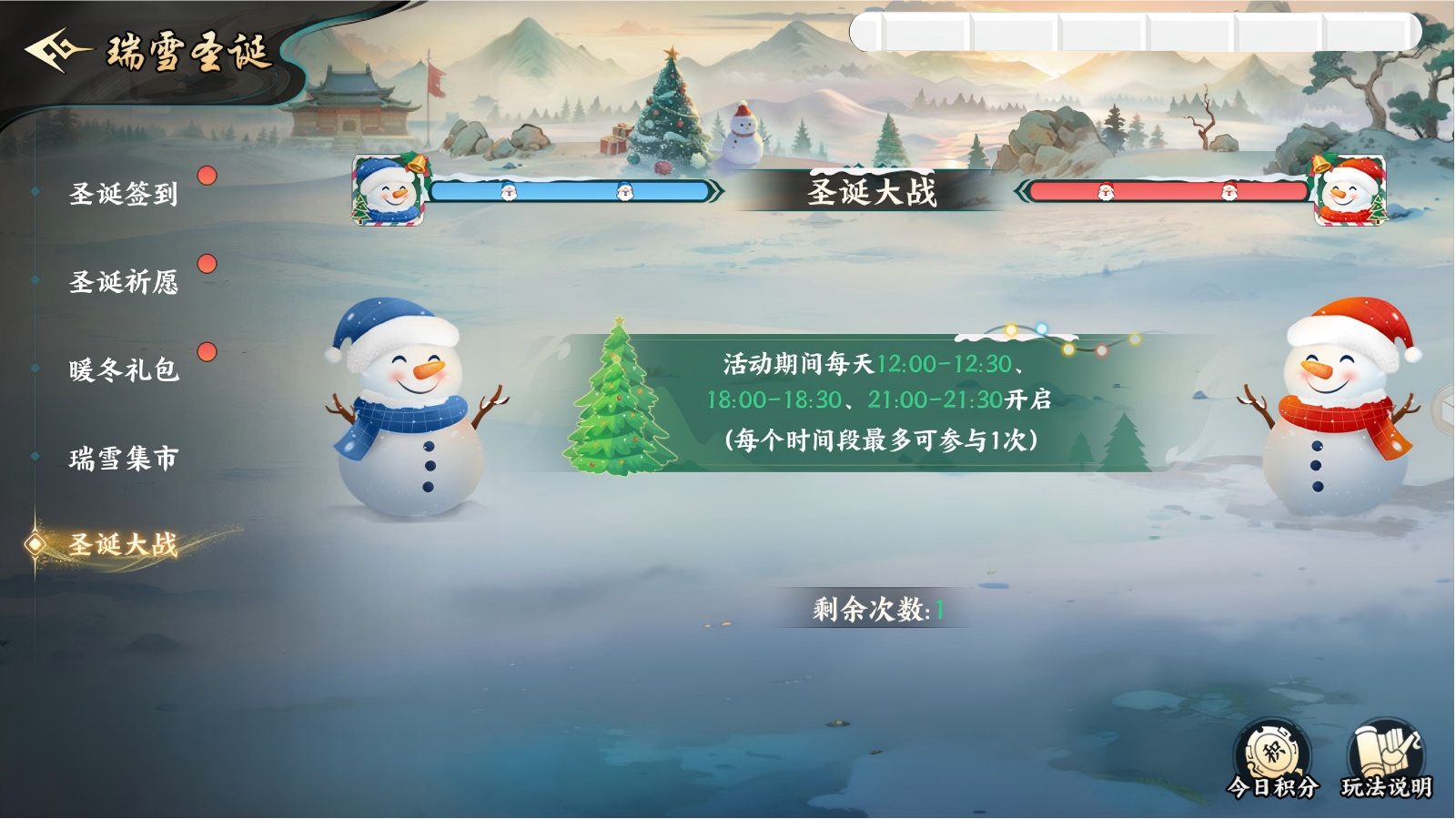 主公们在定时开启期间(每日12:00-12:30/18:00-18:30/21:00-21:30),参与活动时随机分配为红蓝双方,通过免费补兵、派遣将领、释放技能等方式增加参与度并获得圣诞大战积分,以赚取更多的“瑞雪积分”,小蝉蝉给大家录制了一个演示视频,可以提前了解一遍哟。