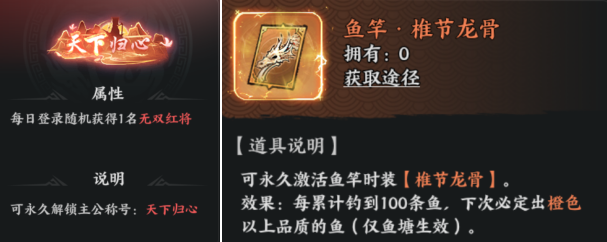 小蝉蝉来爆料今年圣诞节活动啦,本次会有较多的称号、时装等等,最主要的竟然返场鱼竿“椎节龙骨”这可是钓鱼神器,称号“天下归心”更是每日送无双红将。