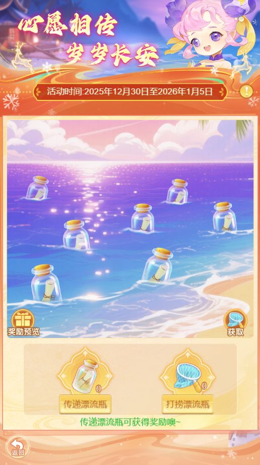 2.打捞获取的漂流瓶可进行传递,传递漂流瓶后可获得奖励