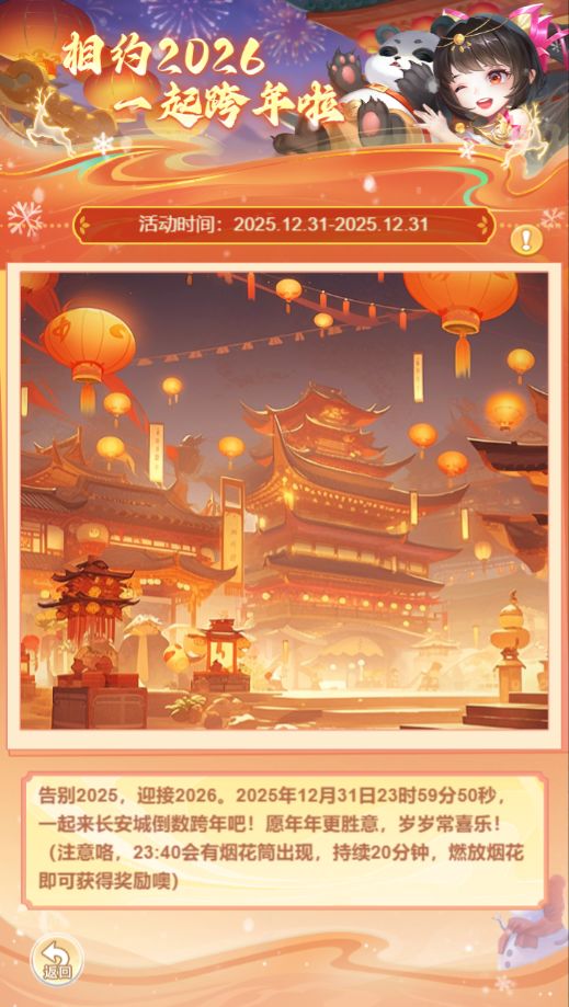 2025年12月31日23时59分50秒,一起来长安城倒数跨年吧!愿年年更胜意,岁岁常喜乐!(23:40-00:00在长安城会有烟花筒出现,燃放烟花即可获得奖励噢)。