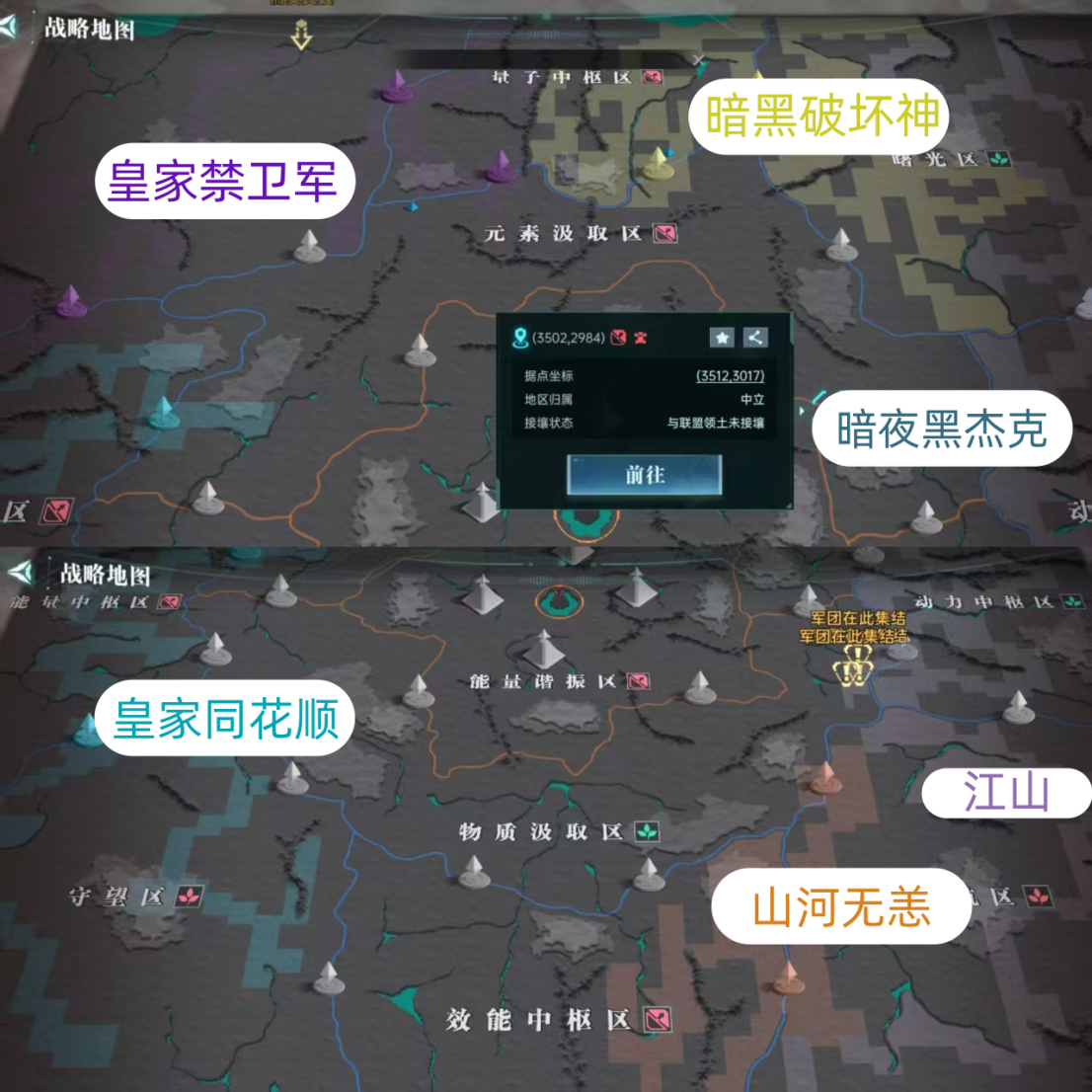 开关前夕,江山放出“打全区”风声,引发皇家同花顺与暗夜黑杰克迅速反应。两盟分别从上下两路封锁江山出关路线,暗夜黑杰克更提前派遣分队进入天启成立“山河无恙”,成功阻断江山向上发展通道。