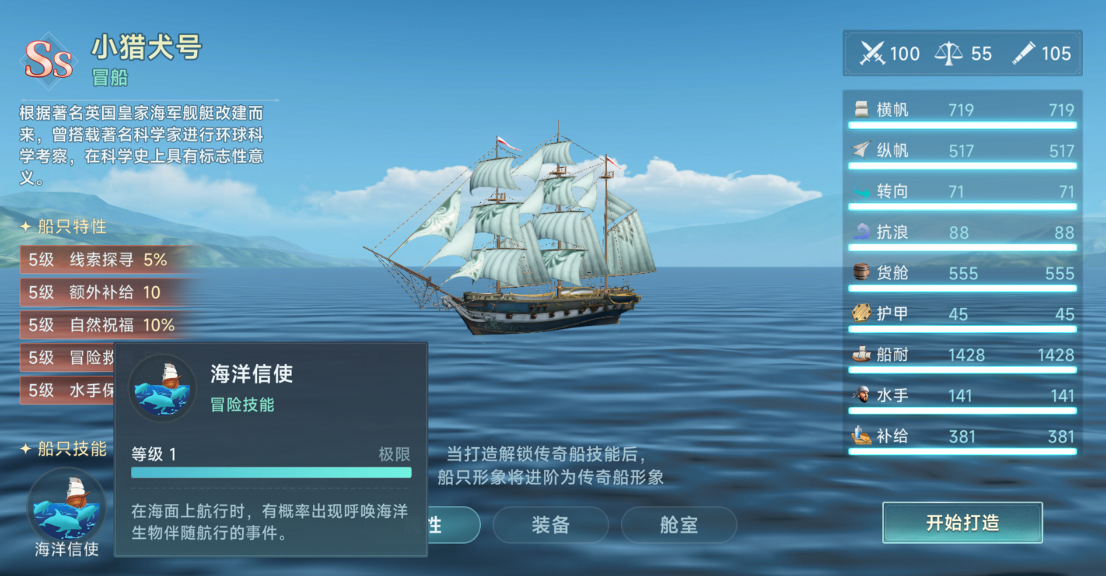 105级小猎犬号——整整体更高耸,配备特殊涂装、自带船首像,并且每个桅杆都设有瞭望塔,视野全方位升级!每个桅杆更多一些帆,船体水线会更深一些这样海上航速及抗浪更优秀!猫猫锐评:更快更快更快!是我们冒险船的使命。