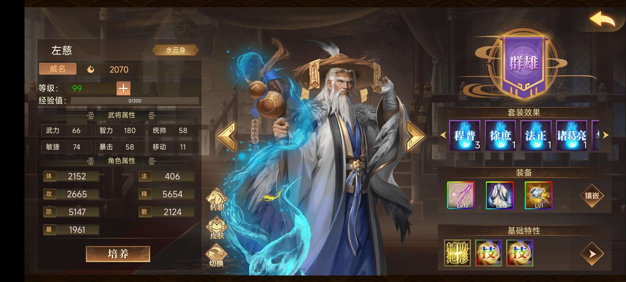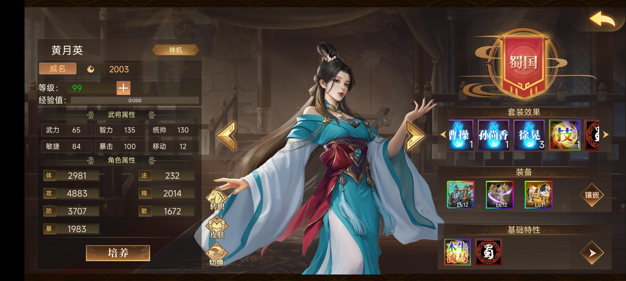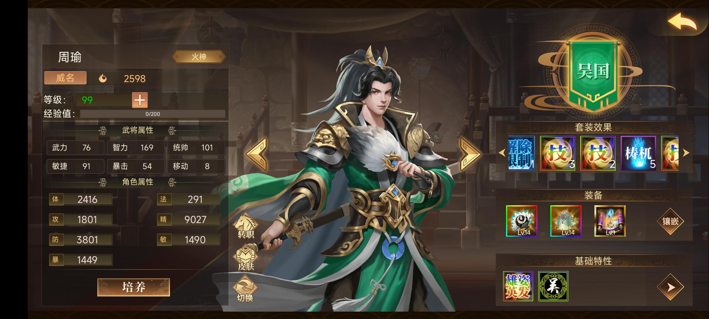 出战武将:周瑜(主力)、左慈(加面板、慌骗、增伤)、贾诩(全屏毒、嘲讽肉)、马云禄(打解烦、增伤)、月英(追击打标记、增伤、喂药)、大乔(传送、麻痹、增伤、女装嘲讽)