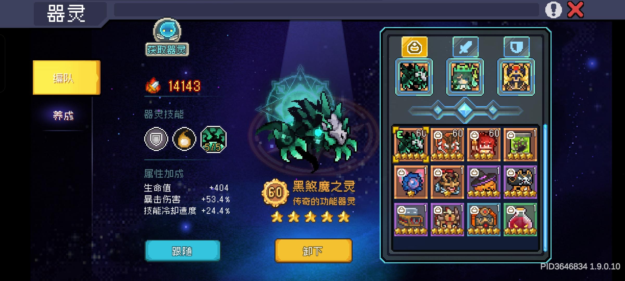 器灵:绿弓提供20暴击率和25暴击伤害总增,甲虫可换赫拉(疑似绝版?)或雅典娜,功能位刷图狰兽,打桩黑煞魔(赫斯提亚可先挂buff),打塔蚊子