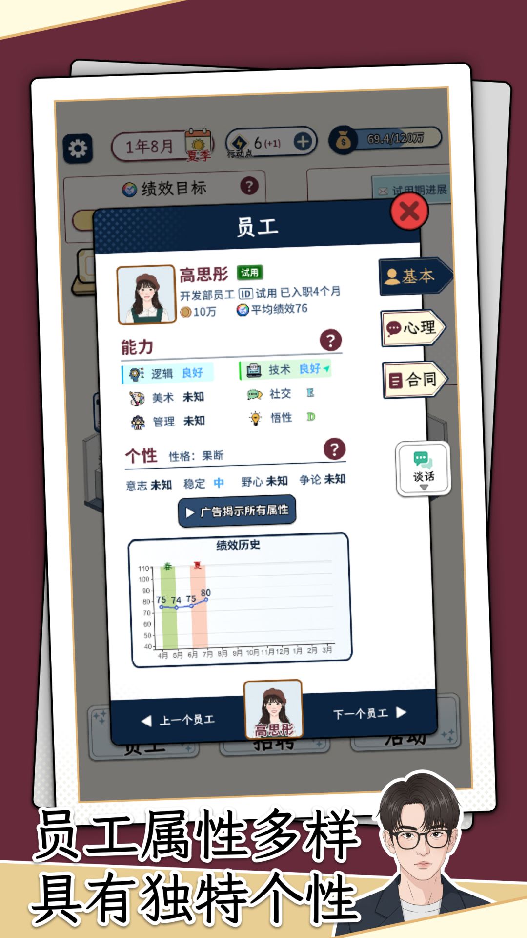 每个员工有随机的能力(包括专业能力、管理能力与悟性)、随机的个性(你会发现有的员工在谈话时更喜欢回怼你,而有些员工可能会为了追求利益而跳槽到更大平台)、多种承诺与背景故事,以及未来会推出的心情与想法系统(有人可能会因为工资太低而emo,也有人会因为得到了表扬或重用而开心)。