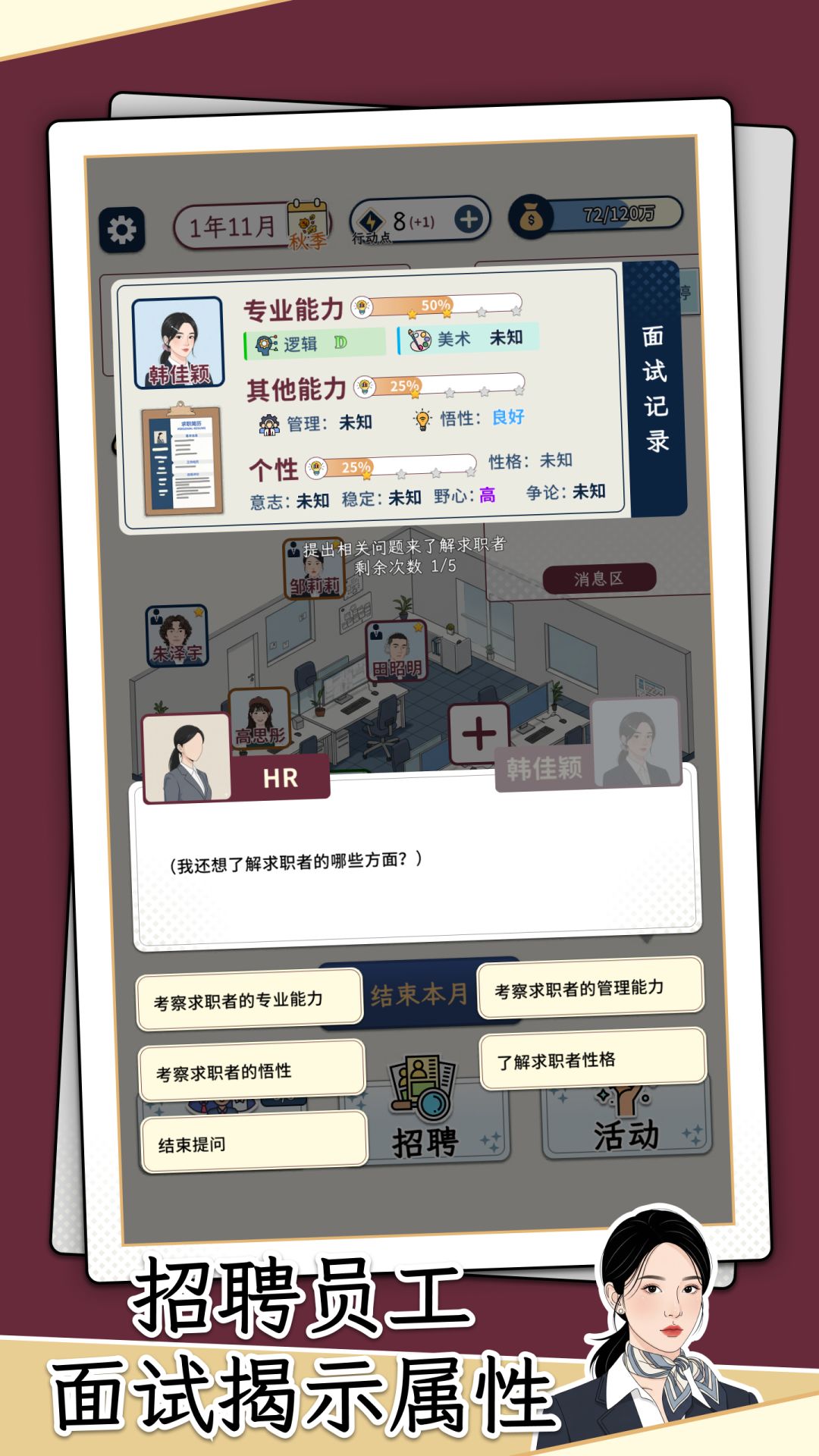 既然是以HR(即管理人力资源的岗位)的工作为题材的游戏,自然离不开【招聘】和【人才】两大要素,游戏的目的是努力招聘到最合适的人才,并管理好公司里的员工,通过不断优化员工阵容来争夺最高荣誉。而本游戏的员工系统和招聘系统就是最突出的特色。