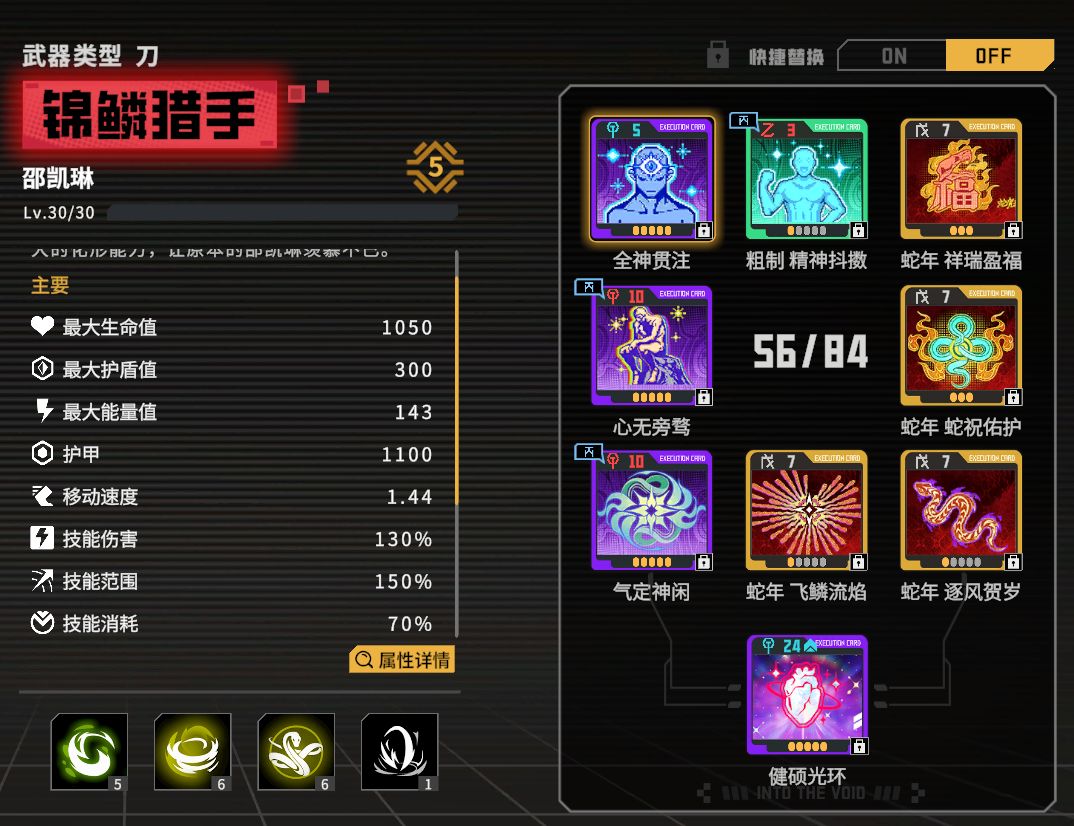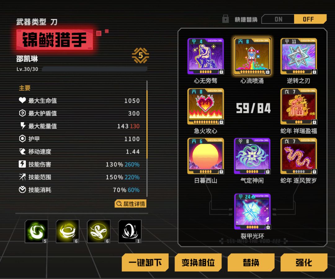 裂甲光环增加伤害,逆转之刃与心无旁骛增加技能范围,双蛇卡(福袋和任意蛇卡)增加续航,刷取日暮西山、心流奔涌和急火攻心,增加强度与减少消耗。心无旁骛可以根据喜好换成全神贯注增加强度;条件允许可以解锁信手技2,在对单环境更好叠加被动