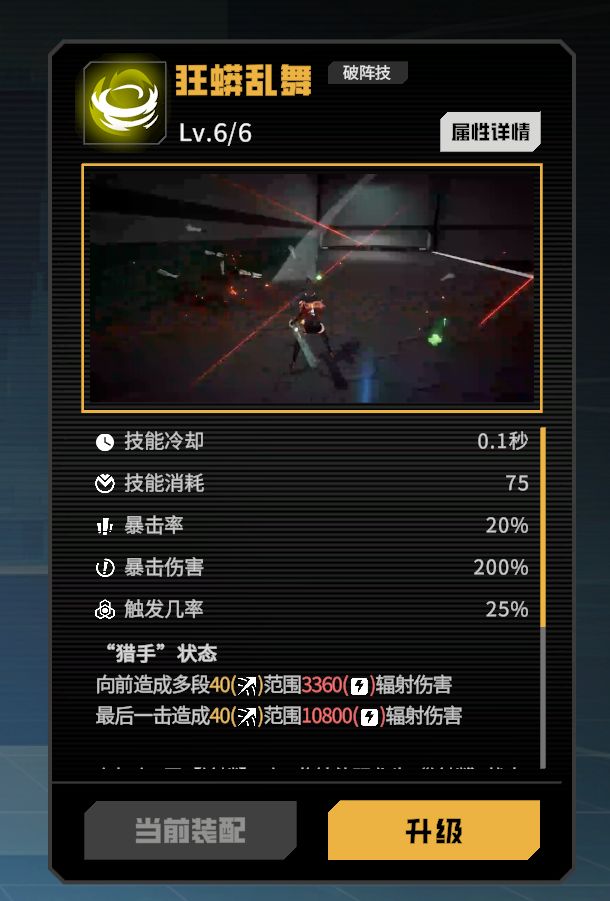造成范围辐射伤害,每命中一个敌人可以获得一层被动层数因为辐射异常可以降低敌人护甲,病毒异常可以提供基于病毒层数的额外增伤,所以通常输出手法为:风格技为敌人附加辐射异常破甲,获得被动层数,然后使用强化破阵技打出病毒伤害