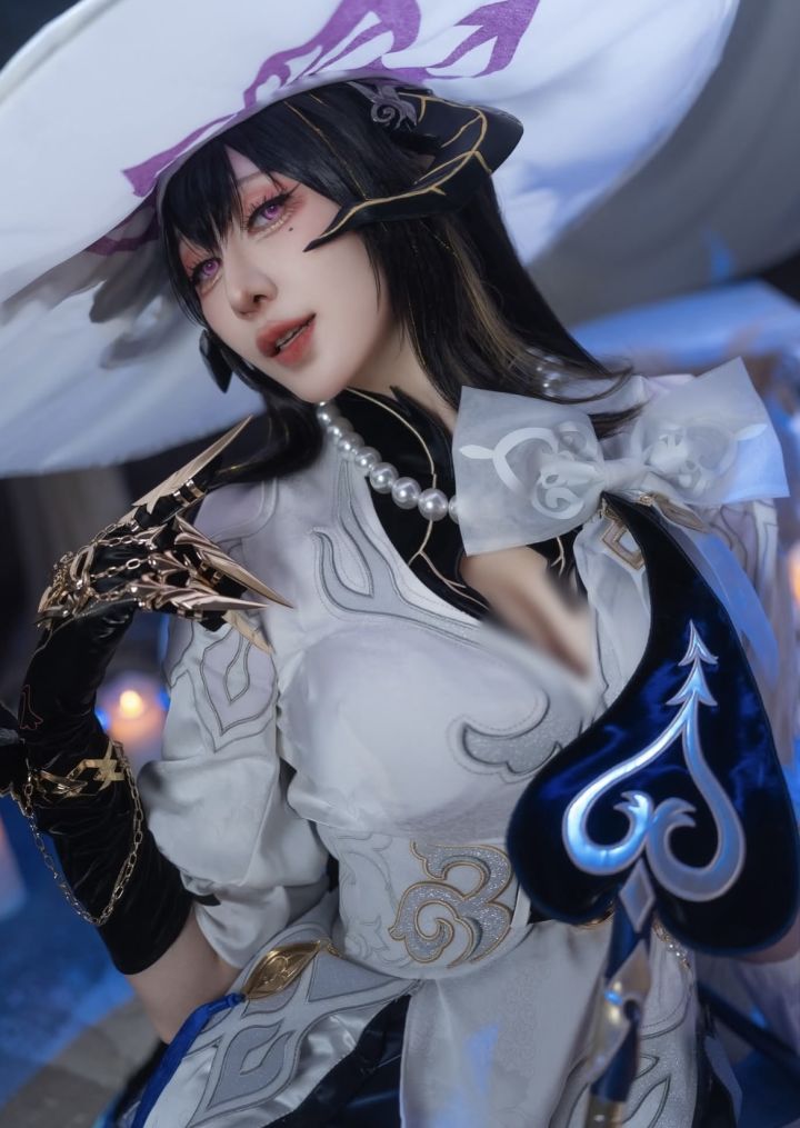 这组cos的还原度与精致度直接封神!黑棕渐变的长发搭配带有紫纹的白色宽边帽,瞬间勾勒出角色的神秘与优雅。妆容上,粉紫调眼妆衬得眼眸魅惑,泪痣的点缀更是点睛之笔,唇色的暖红与白黑蓝配色的服饰形成绝美反差,将角色的冷艳与娇柔融合得恰到好处。白色为主的服饰布满精致的纹路与金色刺绣,珍珠项链、金属手套的细节拉满,蓝紫色的装饰与帽檐的花纹相呼应,还原度超高。侧身的姿态慵懒又矜贵,背景的冷调光线营造出梦幻的氛围,仿佛从游戏剧情中走出的核心角色,每一个细节都把角色的魅力诠释得淋漓尽致!