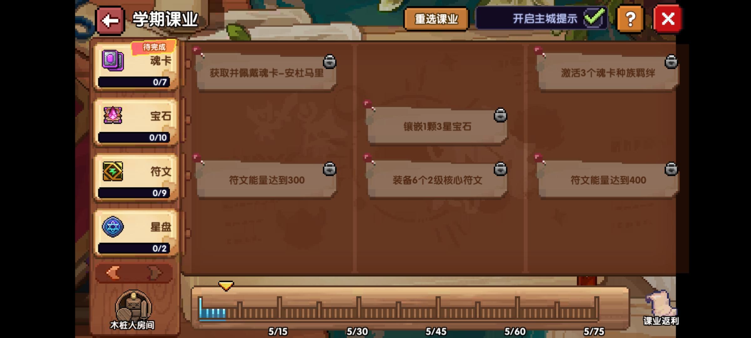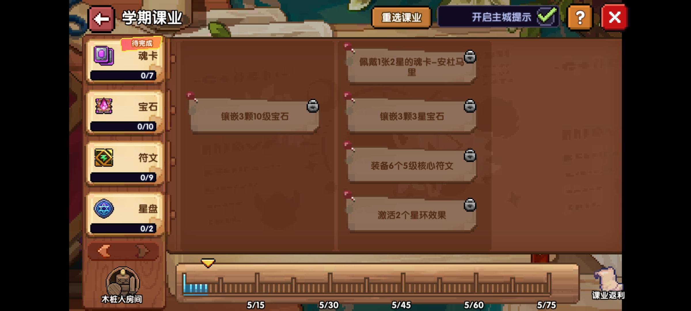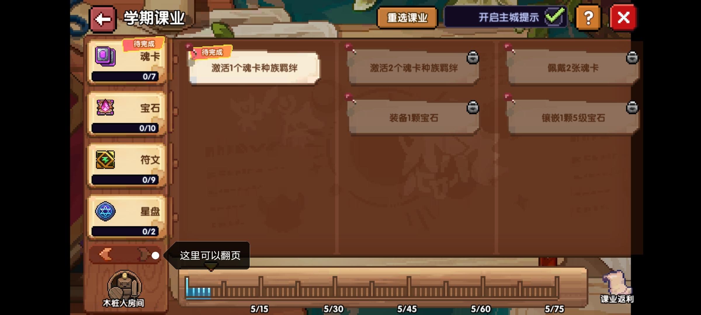 然后在左下角翻页后,这个魂卡羁绊可以装一下,完成一下任务再卸下就可以,还有这个宝石升级的任务,前面十级的升级分级之后是没有任何损耗的,所以也可以拿着白色宝石升级完成一下任务就行