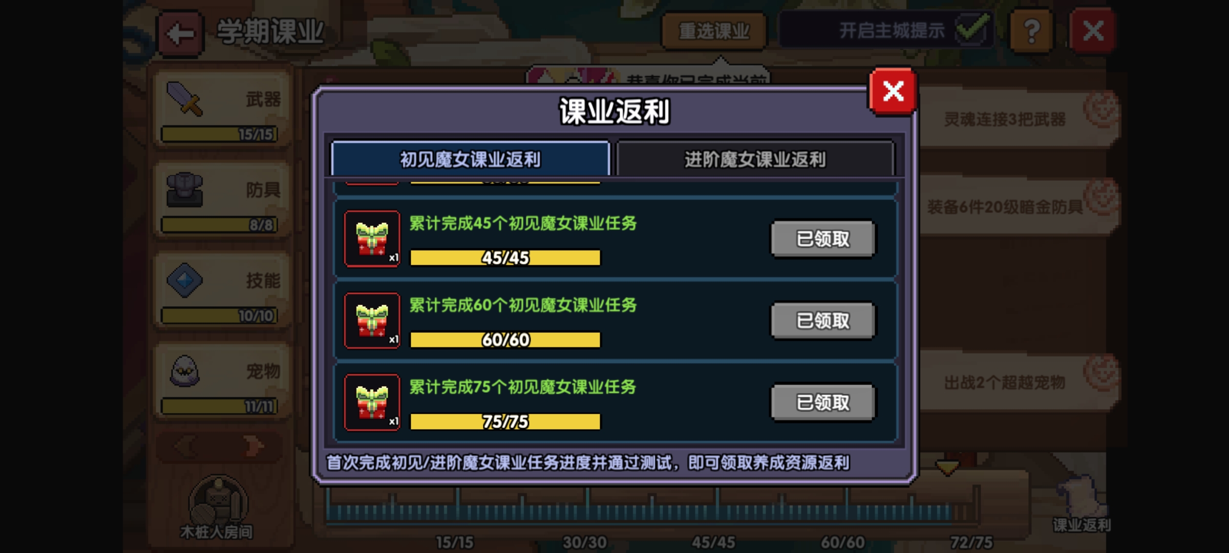 100层以前用的都是最初始的那个魔女,然后就发现了一个东西,就是阿兔学堂(之前没注意,还是别人提醒我的)这个分两档奖励,一个是只能,用初见的那三个魔女来完成任务,另外的是用进阶的才能完成任务。但是那个任务100层以前也可以搞定初见的任务,这样在资源紧缺的时候就能获得这些资源了,麻烦一点完成任务。(也就随手的事,抽了新武器可能就把这个老武器当狗粮喂了,后续完成这任务还要做,不如前期就搞了)