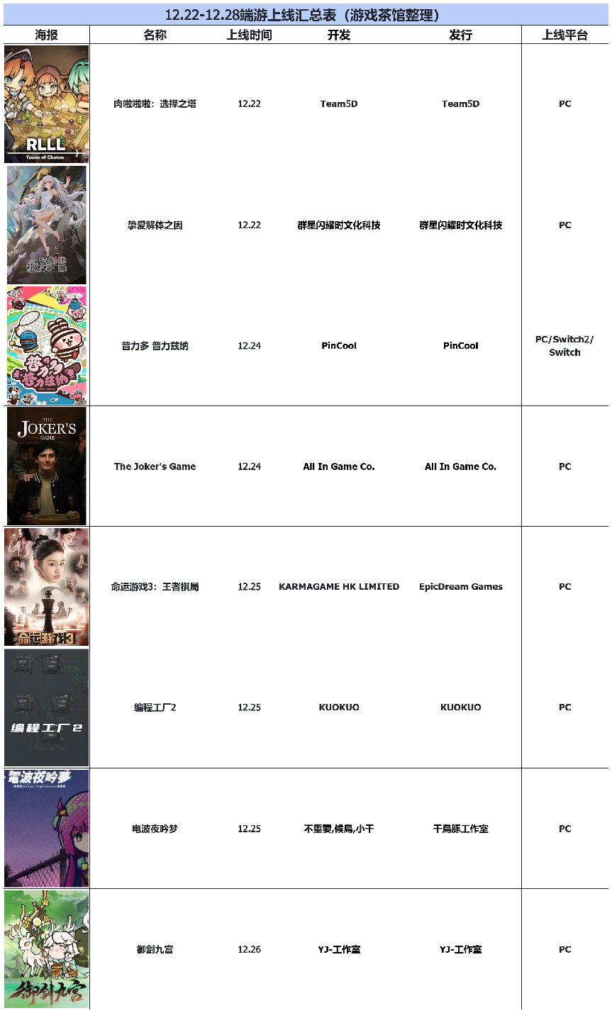 临近圣诞,游戏茶馆整理了下一周内(12/22-12/28)即将上线的新游戏。