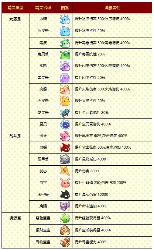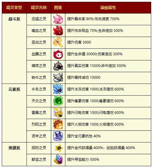 当前版本中一共有33种不同的精灵,它们能为勇者大人提供多种不同程度的增益。根据精灵提供属性增益的不同简单分成三类,战斗系能给勇者大人提供有对基础战斗属性有增益的,如吸血、暴击率、减伤等等;元素系能给勇者大人提供元素有关的增益,包括元素伤害、元素抗性;资源系是能够给勇者大人提供高额的资源获取量,包括金币、经验、掉落品质三种。