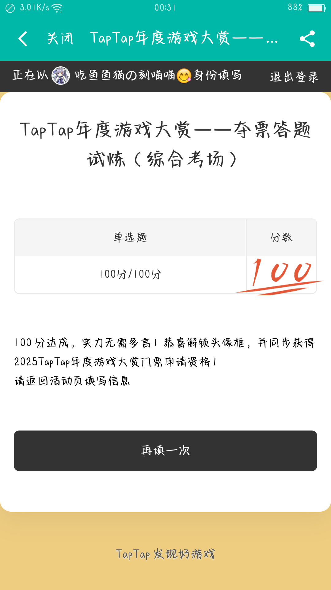 另外我Tap上的答卷终于拿到100分了😭🙌,喜提头像一个😁