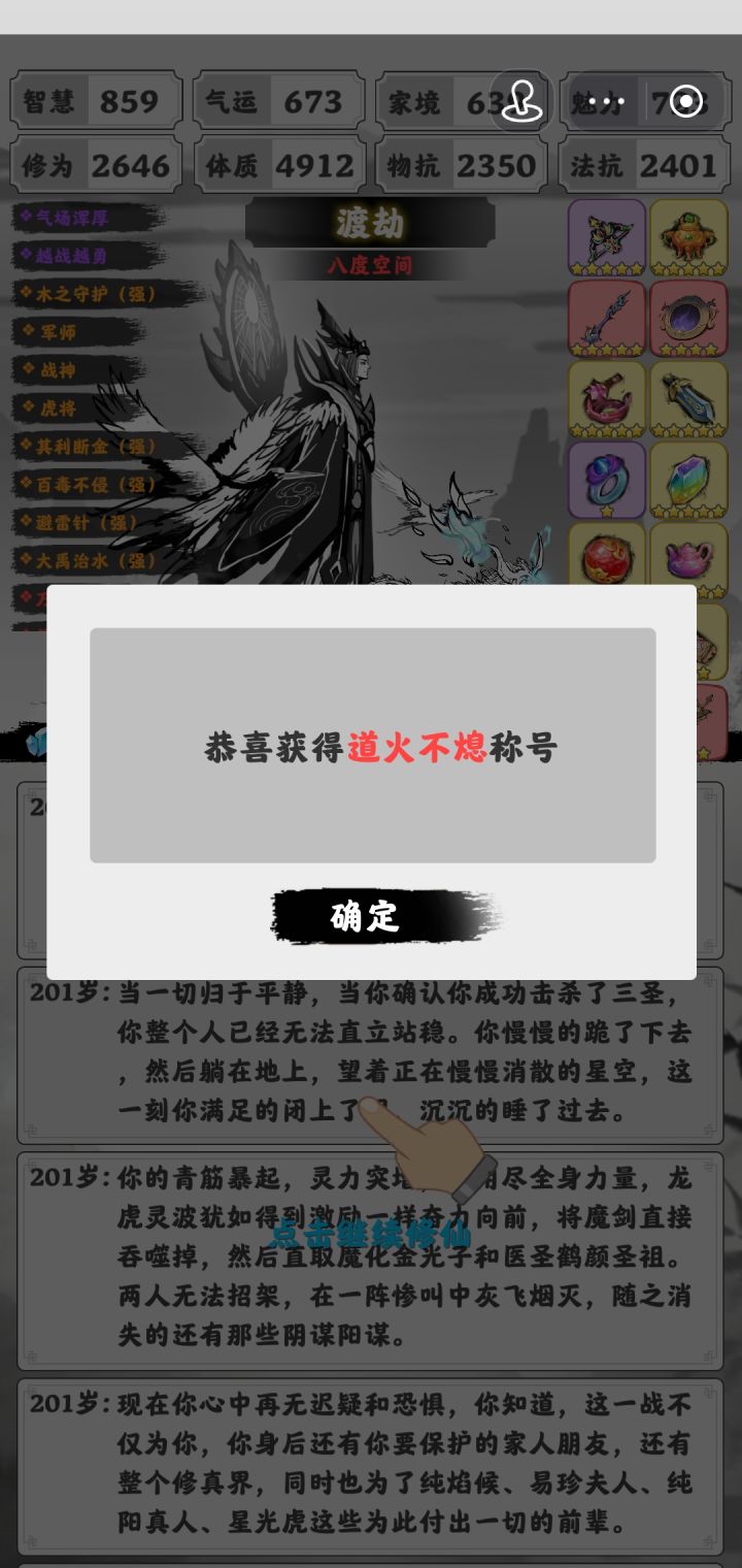 八度射日弓开,如来二十三全跑,宠物雷火。前期留混天绫,75岁前出木鼎,142极难本局2000体质900物法冲不了,171极难好打,172极难75木75金过(but下一局道火就没过,疑似狗运)词条无金出金珠,控四维智慧最高打星光虎,邪眼忘了打的救世主还是极难,197极难法圣选正方形100火抗,197之后卖火扇换土钟,200丹王注意600家境判,打完土钟换小毒戒(宠物无毒,60毒抗感觉不够)最后多个三万左右。顺带一提,百抽百中是这把拿的,原理不明。