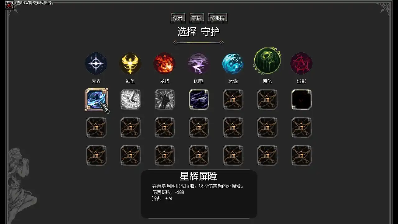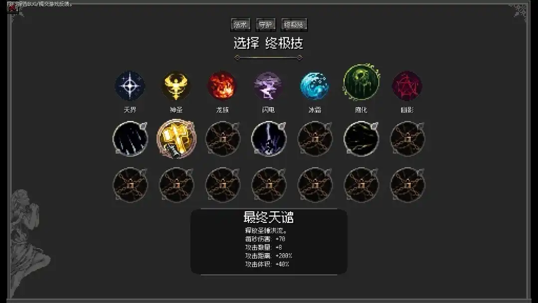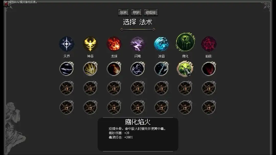 技能分为法术、守护、终极技能三种,每种都有属性:天界、神圣、龙族、闪电、冰霜、腐化、幽影总共七种