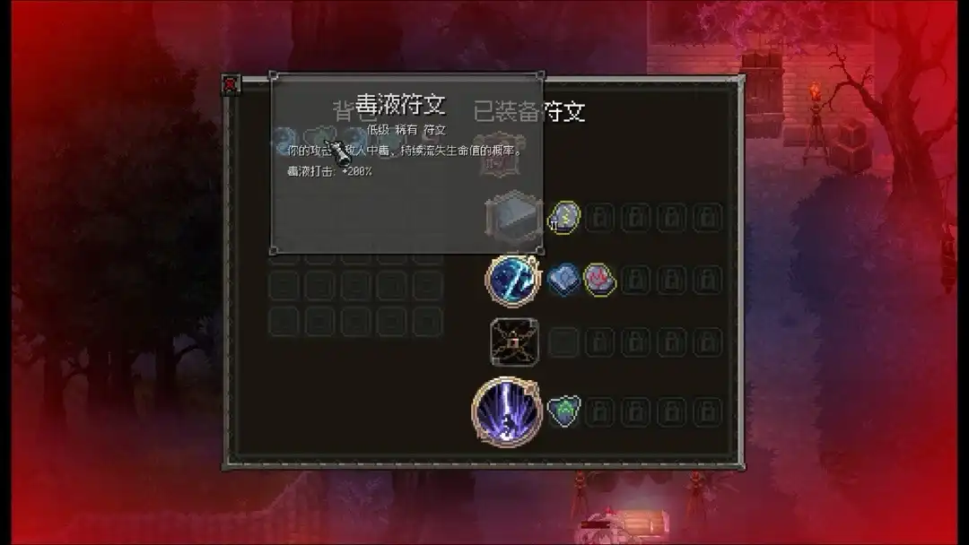 这里面有些技能护符我要推荐一下,强推毒属性的,砍一刀拉开他会慢慢被毒死,极大的降低游戏难度,给技能搭配上额外的特效护符,能让技能释放更加强大