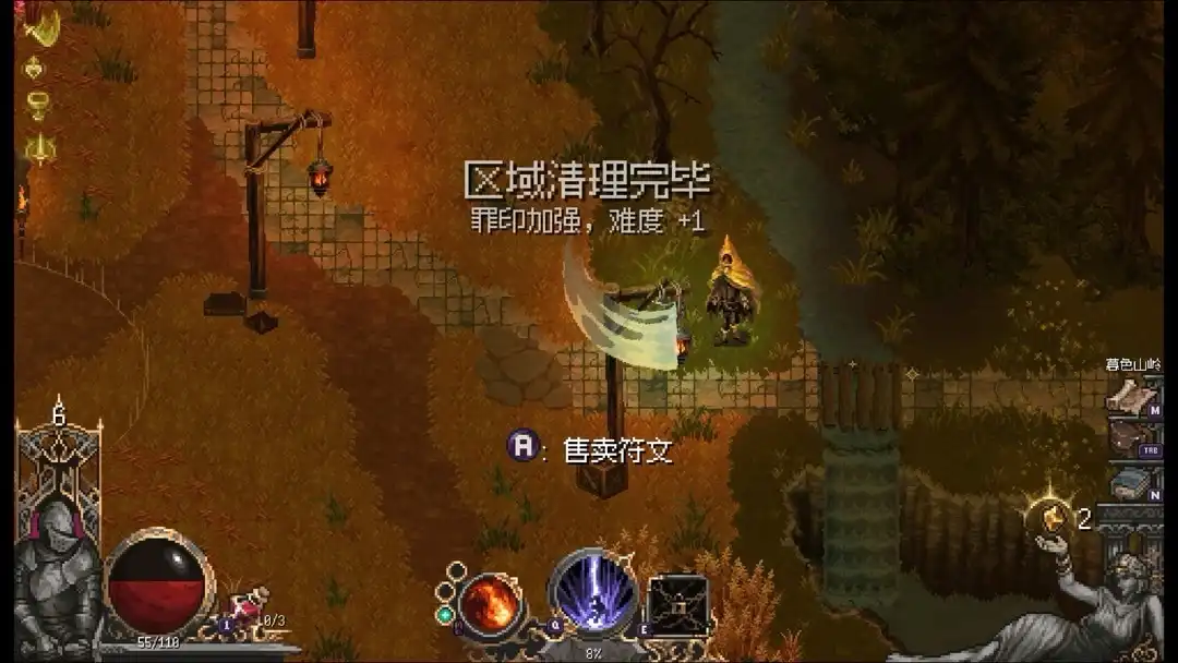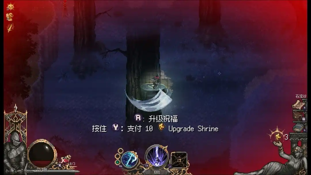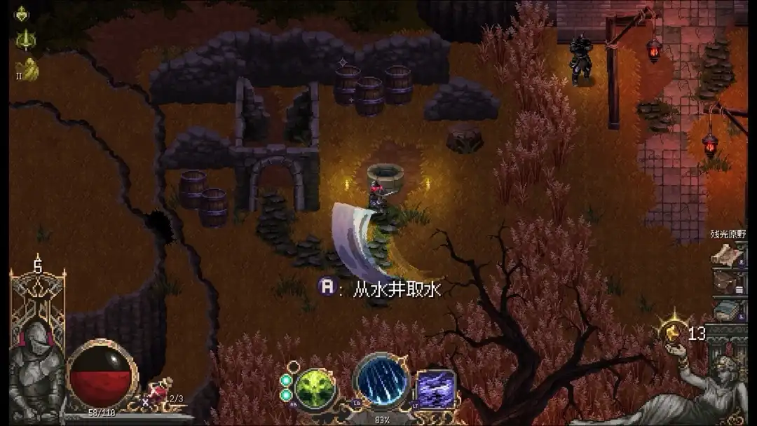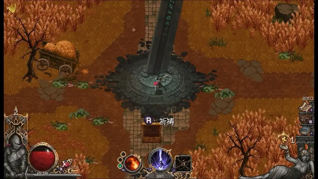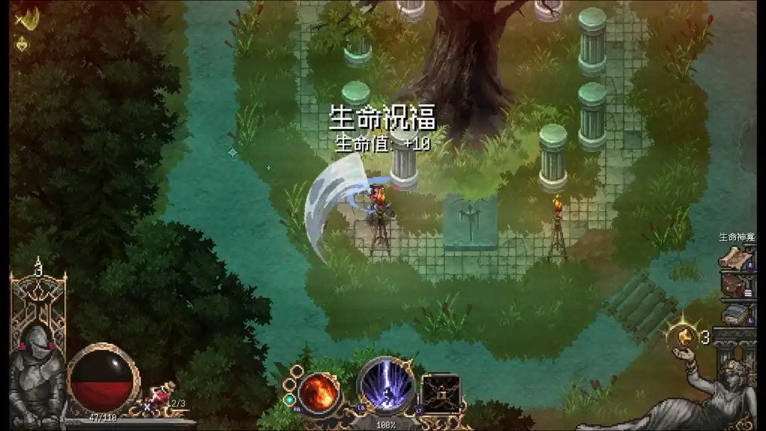 打这个boss有两种方法,一个是不断的挑战,练熟了慢慢磨死,另一种则是把地图资源全部拿了,祝福、护符什么全部拉满,这样Boss难度就会大大降低,可以根据自己喜欢的打法自行挑战,另外注意boss房左侧有口水井可以恢复20血量,别忽略了