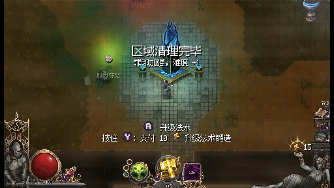 我们进入一个区域后要清除关卡内所有怪物即可,完毕后在关卡会有地板,站上去就会有赐福,赐福就相当于是肉鸽buff,不过是纯粹的随机,且可以升级,升级办法也是通过有些关卡内的升级装置来完成