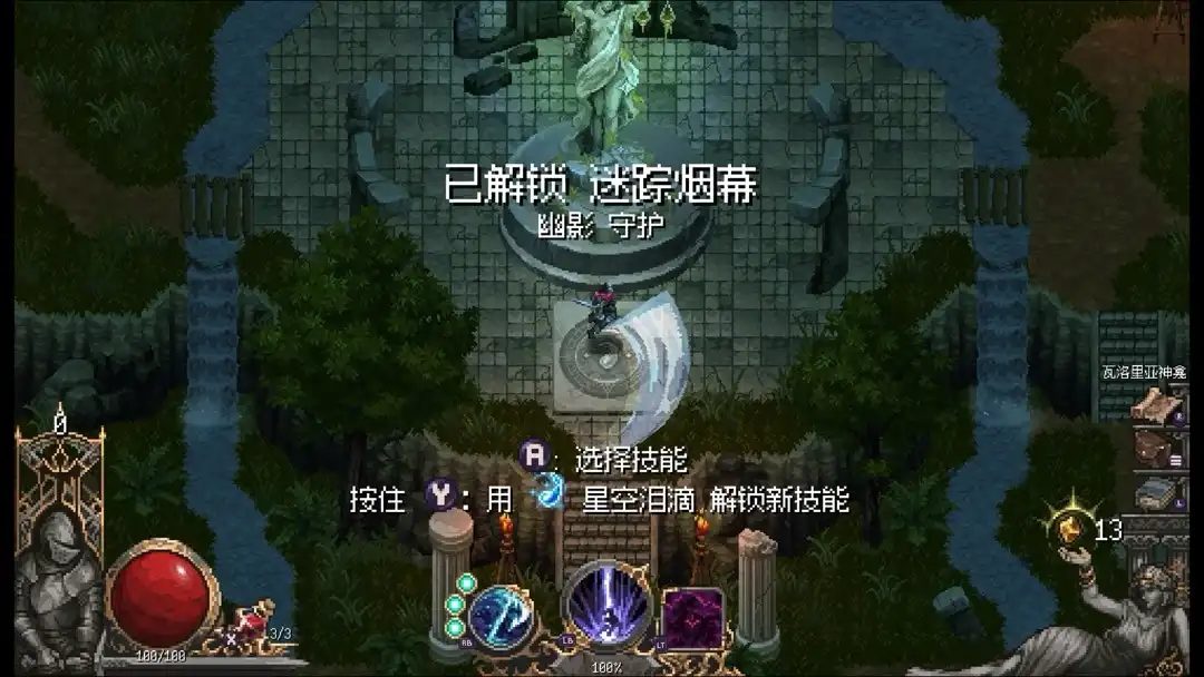 技能靠星空泪滴来解锁,复活点前面的神像就是配置技能的。