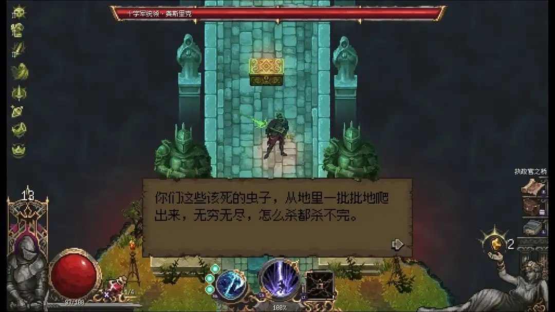 我们解锁boss并不是直接来就可以,而是先去往右侧拿取开启大门的钥匙,钥匙在木质宝箱内,且不会因为死亡掉落,而是永久携带