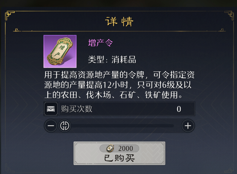 增产需要消耗道具【增产令】,每块土地能用1个。该道具可以在【商贾】-【工造商店】中购买,每日限购两个。