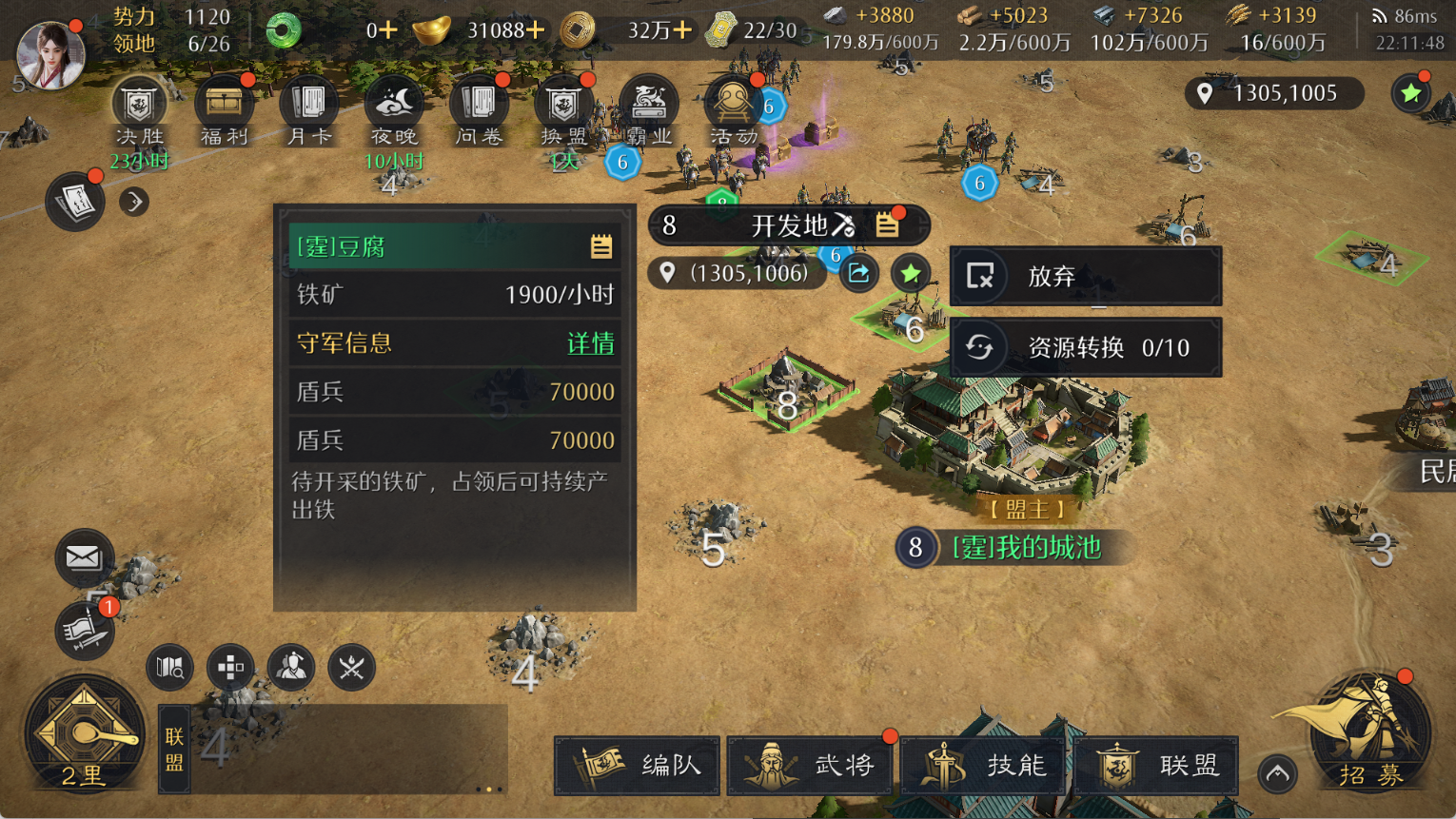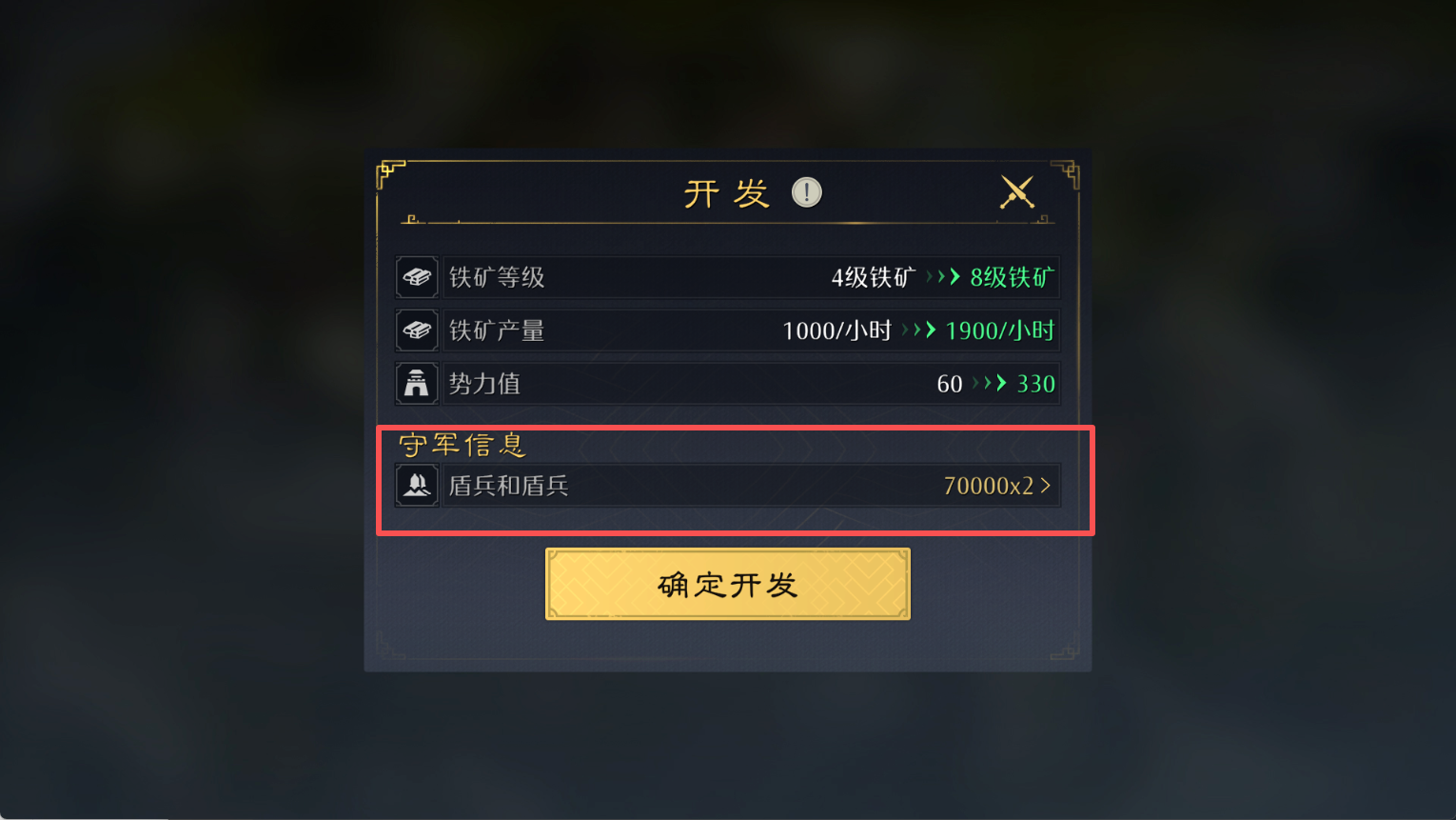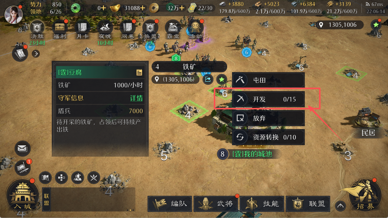 功能解锁后,我们可以任意选择一块自己1-5级的非铜矿资源地,通过开发功能提升至8级资源地。