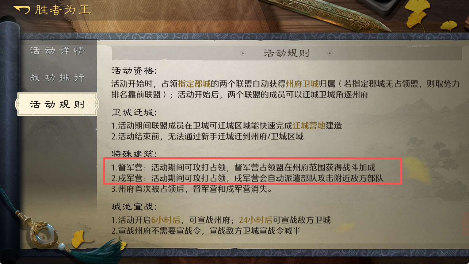 争夺州府在州府的范围内,还会有特殊建筑,4个【戍军营】和2个【督军营】。