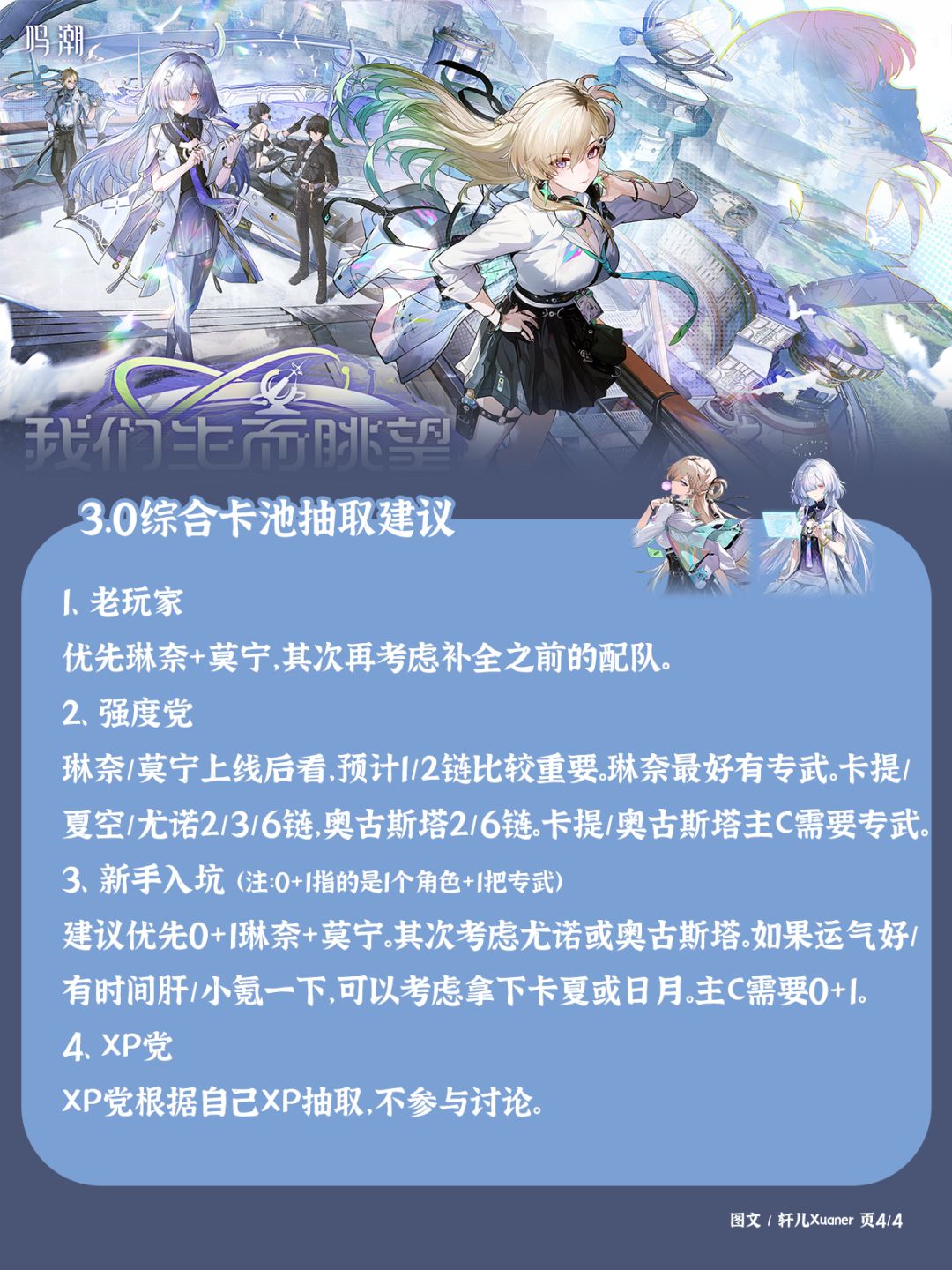 ② 老漂:依旧根据自己卡池决定。建议优先把琳奈和莫宁拿下后,再去考虑补角色。琳奈和莫宁是新机制的当前版本核心,各种副本环境应该会有不错的加成,抽到后玩的会更舒适些。补角色的话,如果有卡提,需要补一只00夏空。如果有奥古斯塔或尤诺,可补可不补。尤诺可以跟琳奈莫宁搭。奥古斯塔用莫特斐也可以。根据自己的星声来。后续版本可能会出新的主C,3.0的两个角色一个副C、一个奶妈。所以也可以预留一点星声给后续版本。