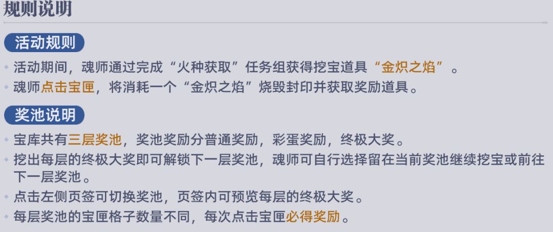 1. 道具获取:完成火种获取任务组,即可得到挖宝道具「金炽之焰」,每开启1个宝匣消耗1个「金炽之焰」,且每次开启必出奖励。