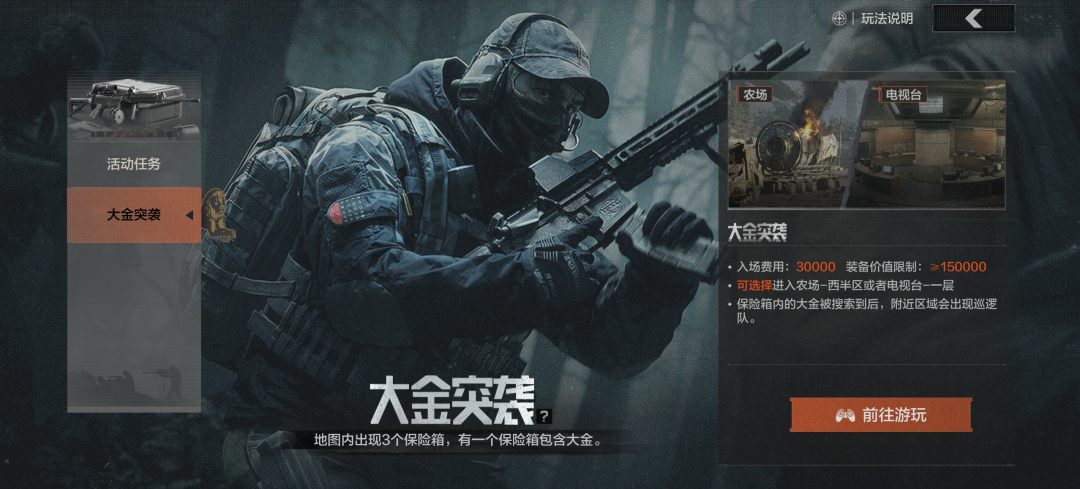 活动期间,限时开放【大金突袭】入口,先锋可选择进入农场-西半区或者电视台-一层,入场需消耗3万柯恩币,带入装备价值需≥15万柯恩币。