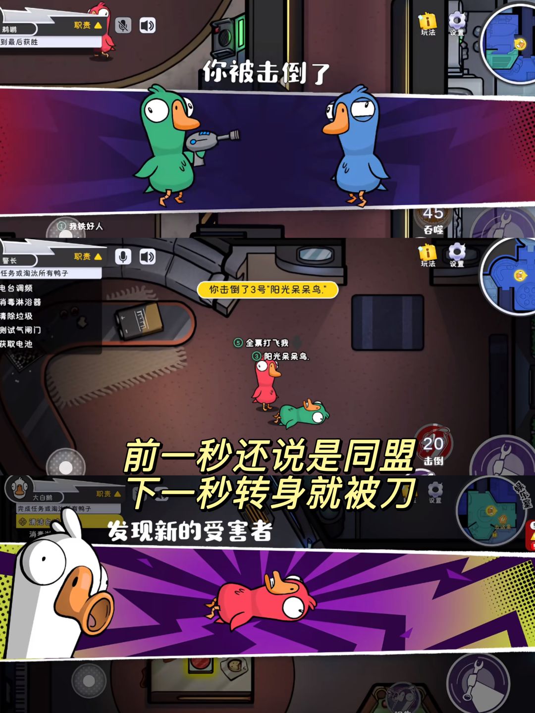 前期可以伪装成好人混在阵营里,中期根据局势来搅局,同时避免过早被鹅/鸭针对,优先达成自己专.属任务。